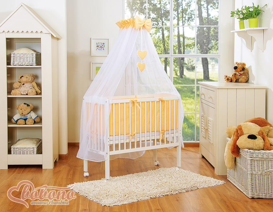 • Beistellbettchen ( 4 Seiten+ Beistellbrettchen mit höheren Seiten und Metallbefestigung an das Elternbett) • Premiummatratze 2 Teilig mit abnehmbaren Bezug • 4 Plastikräder mit Bremsen • Textilien (Bettwäsche, Kissen und Decke, Kopfschutz, , Himmel mit Schmuckellementen, Himmelstange) Abmessungen: L 94 cm, B 44/ 56 cm, H 85 cm Pfirsich Herzen Hängende Bettwäsche Matratze FABIO Beistellbett