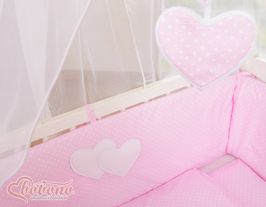Beistellbett mit Bettwäsche und Matratze- Hängende Herzen Rosa-Punktumster Wir präsentieren Ihnen wunderschönes Beistellbettchen welches aus schadstofffreien Materialien angefertigt wurde. Erfüllt die gültigen EU Normen.