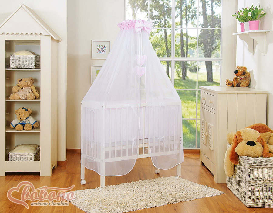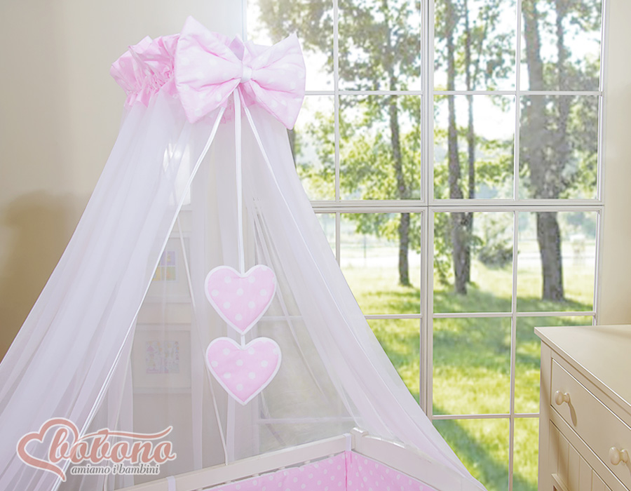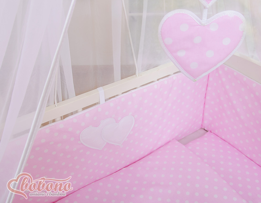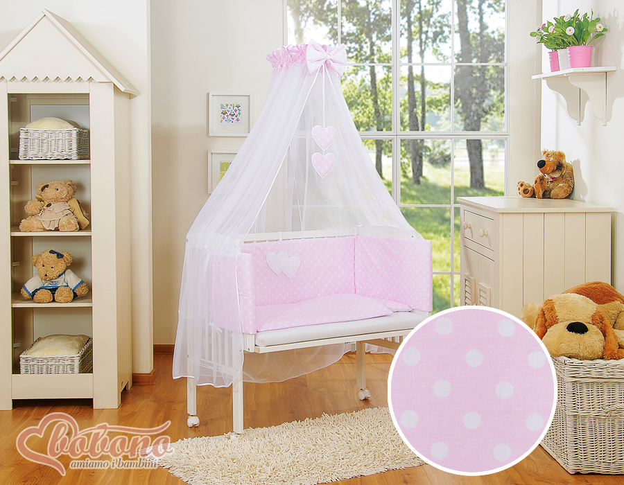 Beistellbett mit Matratze und Bettwäsche Set - Hängende Herzen Rosa-Punktemuster Wir präsentieren Ihnen wunderschönes Beistellbettchen welches aus schadstofffreien Materialien angefertigt wurde. Erfüllt die gültigen EU Normen.