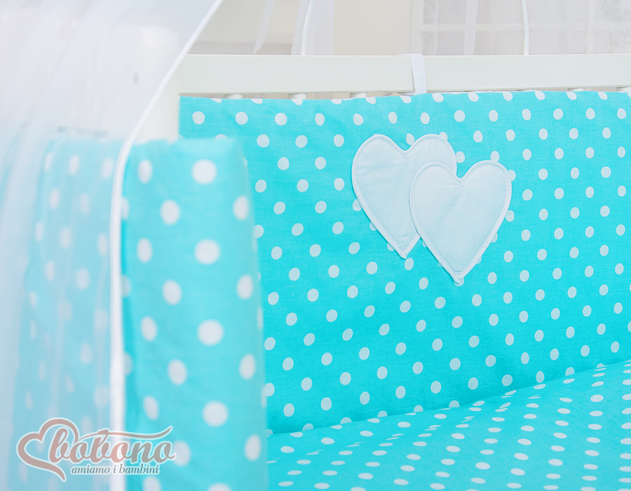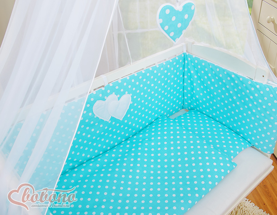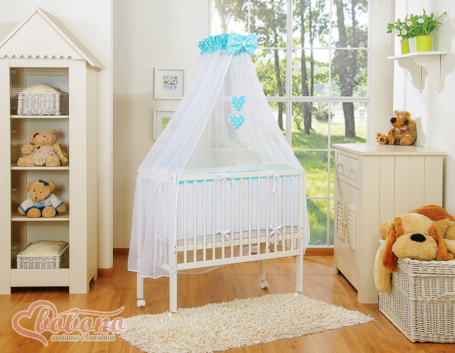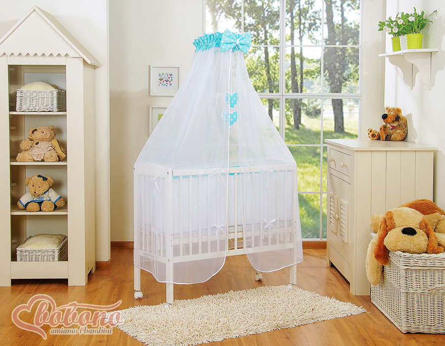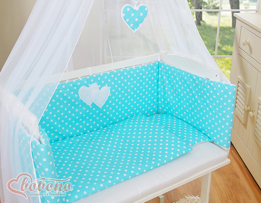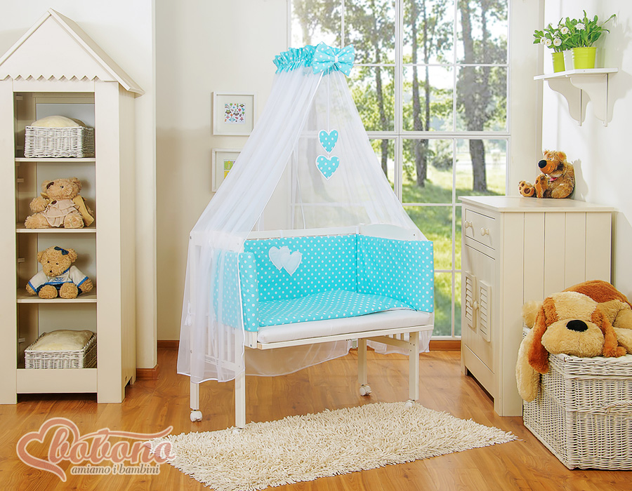 Beistellbett mit Matratze und Bettwäsche Set - Hängende Herzen Türkis-Punktemuster Wir präsentieren Ihnen wunderschönes Beistellbettchen welches aus schadstofffreien Materialien angefertigt wurde. Erfüllt die gültigen EU Normen.