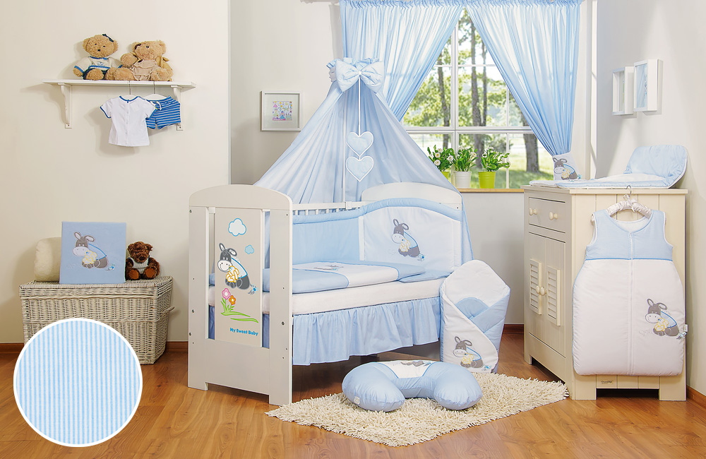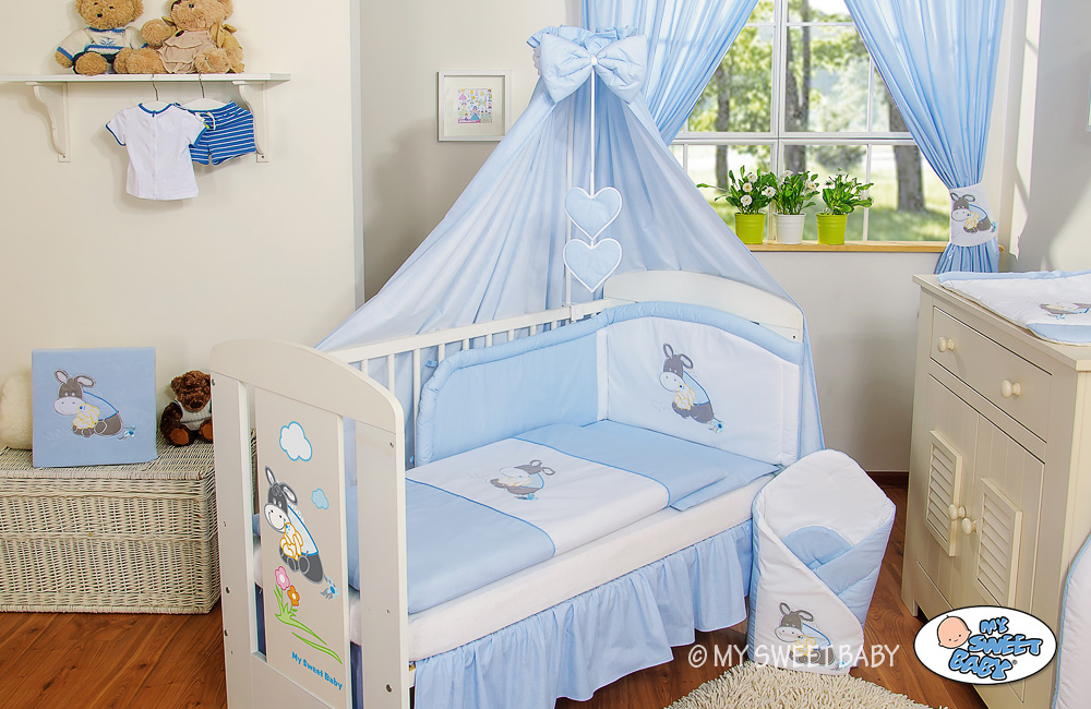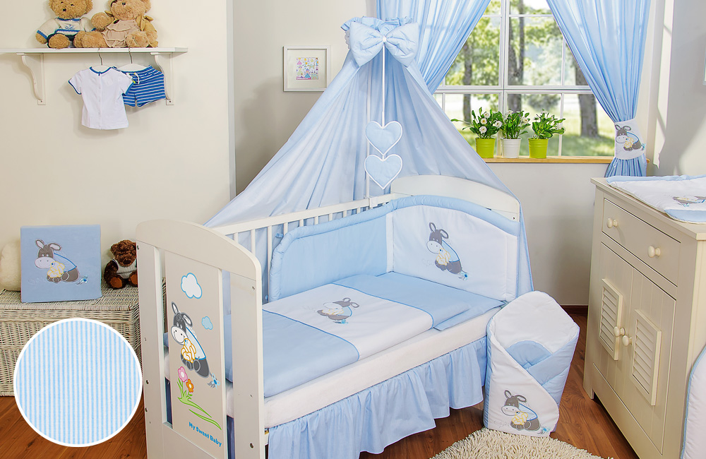 Betthimmel aus Baumwolle - Esel Luca blau Wunderschöner Himmel aus Baumwolle. Schutz vor direktem Lichteinfall und Zugluft. Höhste Qualität und solide Verarbeitung. Mit Hilfe einer Himmelstange kann der Himmel schön über dem Bettchen platziert werden. Das Set beinhaltet: