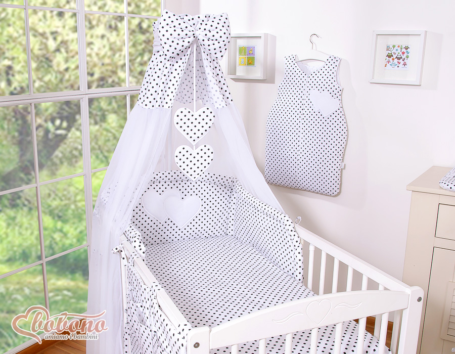 Betthimmel Baby aus Chiffon - Hängende Herzen Schwarz-Punktemuster Wunderschöner Himmel aus Chiffon. Schutz vor direktem Lichteinfall und Zugluft. Höhste Qualität und solide Verarbeitung. Mit Hilfe einer Himmelstange kann der Himmel schön über dem Bettchen platziert werden.