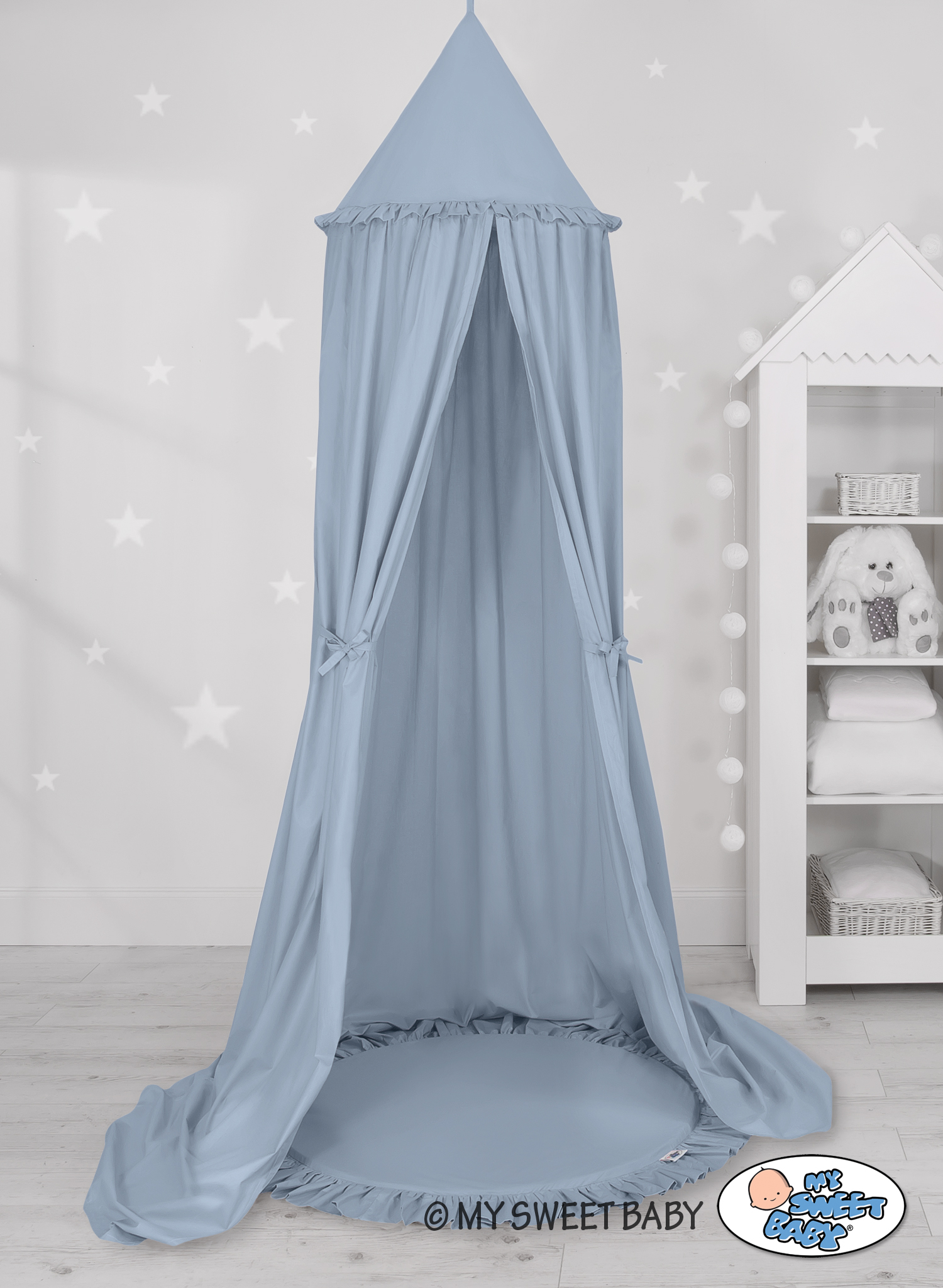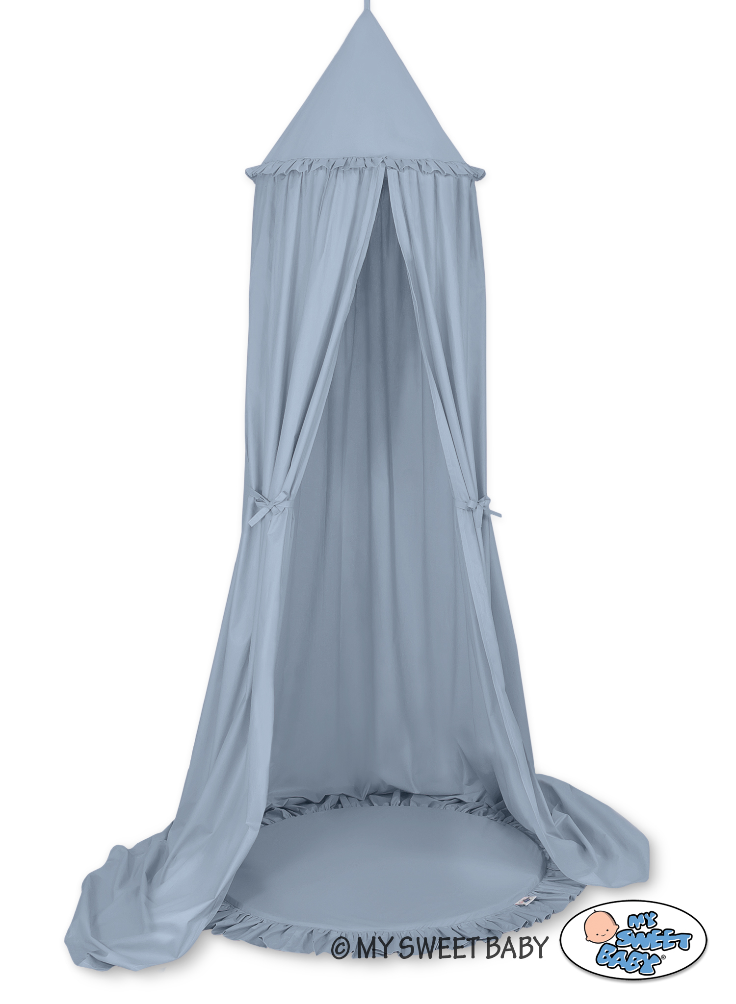 Der Himmelstoff besteht aus sicheren, 100% Baumwolle mit Ökotex Zertifikat. An den Seiten sind praktische Bändchen angenäht. Sie erlauben den Stoff je nach Bedarf oder Idee zusammen zu binden. Der Ring oben kann abgenommen werden. Der Himmelstoff ist bei 30 Grad waschbar. Der Betthimmel in Kombination mit weichen, bequemen Bodenmatte schafft einen perfekten Plaz zum spielen. Die Bodenmatte schützt vor Kälte und ist angenehm weich. Die Einlage kann aus der Spielmatte herausgenommen werden und der Bezug gewaschen werden. Der Spielmattenbezug ist aus reiner Baumwolle mit Ökotex Zertifikat hergestellt.