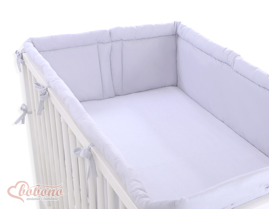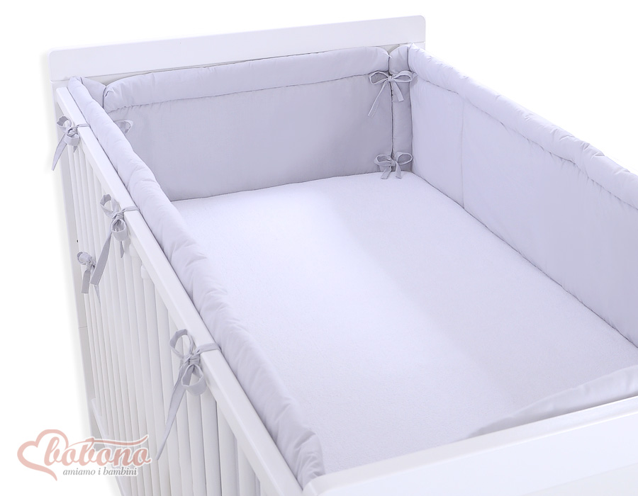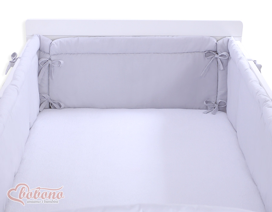 Bestehtaus zwei separaten Teilen. Durch seine zusätzlichen Seitennähte passt er sowohl auf ein Bettchen 120x60 als auch 140x70 cm. Die obere Kante ist gerundet und gepolstert. Der Kopfschutz ist mit einer dicken, antialergischen, atmungsaktiven Silikongewebeschicht gepolstert. Die Füllung besitzt den Ökotex Zertifikat. An das Bettchen wird er mit soliden Schleifchen befestigt. Der Kopfteil mit Herzenapplikation dekoriert.