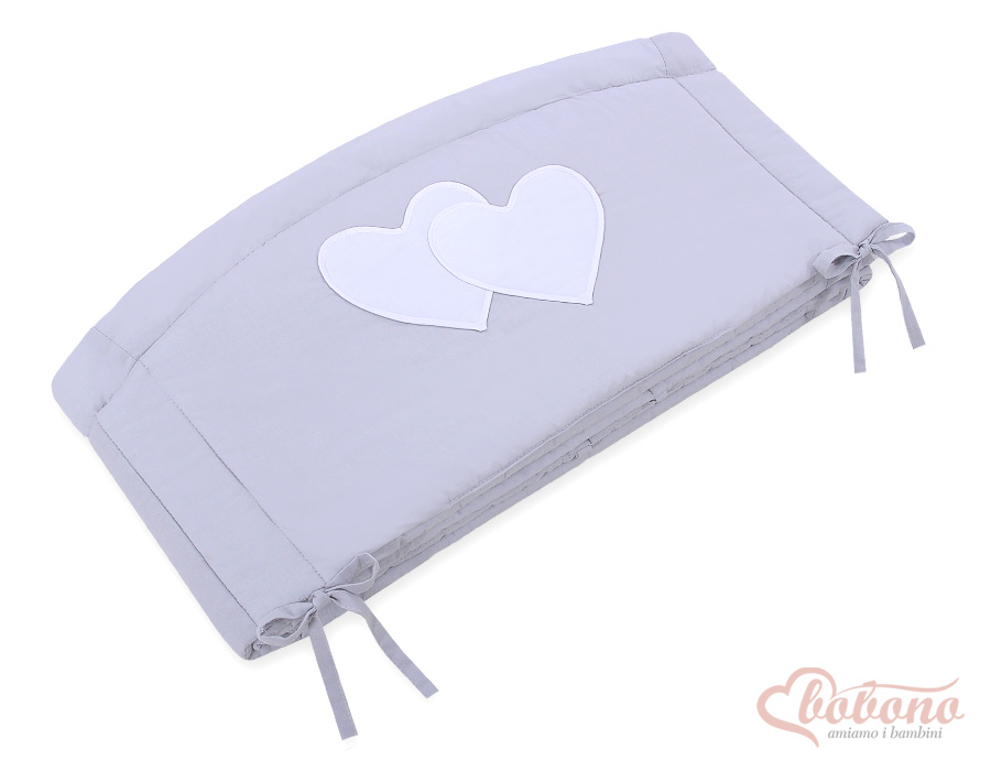 Bettumrandung Babybett XXL- Hängende Herzen grau Ein universal, atmungsaktiver Kopfschutz XXL für Kinderbett. Schafft mit der passenden Bettwäsche eine behagliche Schlafhöhle.
