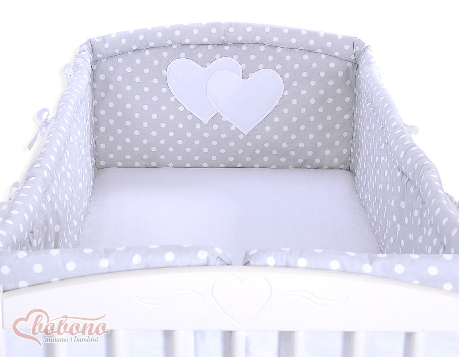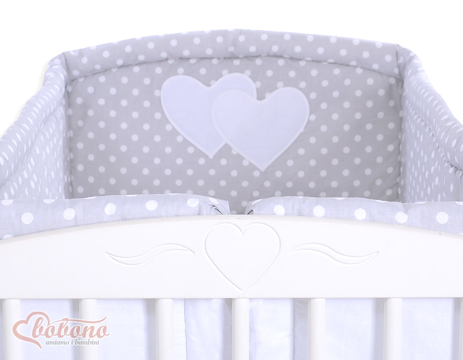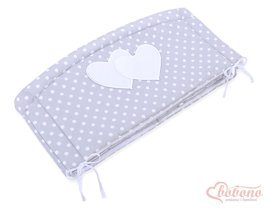 Bestehtaus zwei separaten Teilen. Durch seine zusätzlichen Seitennähte passt er sowohl auf ein Bettchen 120x60 als auch 140x70 cm. Die obere Kante ist gerundet und gepolstert. Der Kopfschutz ist mit einer dicken, antialergischen, atmungsaktiven Silikongewebeschicht gepolstert. Die Füllung besitzt den Ökotex Zertifikat. An das Bettchen wird er mit soliden Schleifchen befestigt. Der Kopfteil mit Herzenapplikation dekoriert.