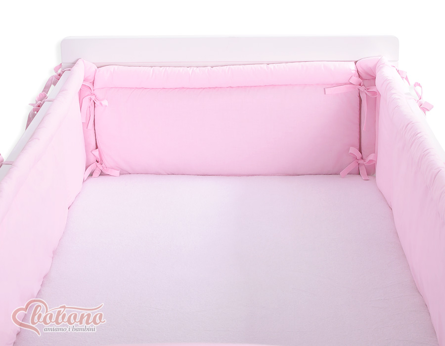 Besteht aus zwei separaten Teilen. Durch seine zusätzlichen Seitennähte passt er sowohl auf ein Bettchen 120x60 als auch 140x70 cm. Die obere Kante ist gerundet und gepolstert. Der Kopfschutz ist mit einer dicken, antialergischen, atmungsaktiven Silikongewebeschicht gepolstert. Die Füllung besitzt den Ökotex Zertifikat. An das Bettchen wird er mit soliden Schleifchen befestigt. Der Kopfteil mit Herzenapplikation dekoriert.
