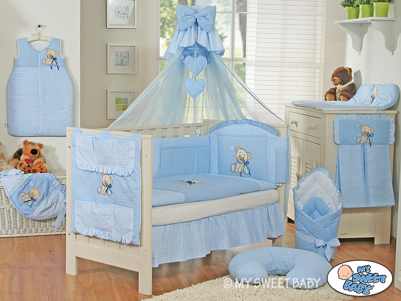 Stubenwagen » Bettwäsche für Babys » Bettwäsche für Babybett BÄR MIT SCHLEIFE » Bettwäsche Sets für Babybett 140cm » Bettwäsche Set 11-tlg mit Moskitonetz » Bettwäsche für Babybett Set 11-tlg mit Mositonetz - Bär mit Schleife blau