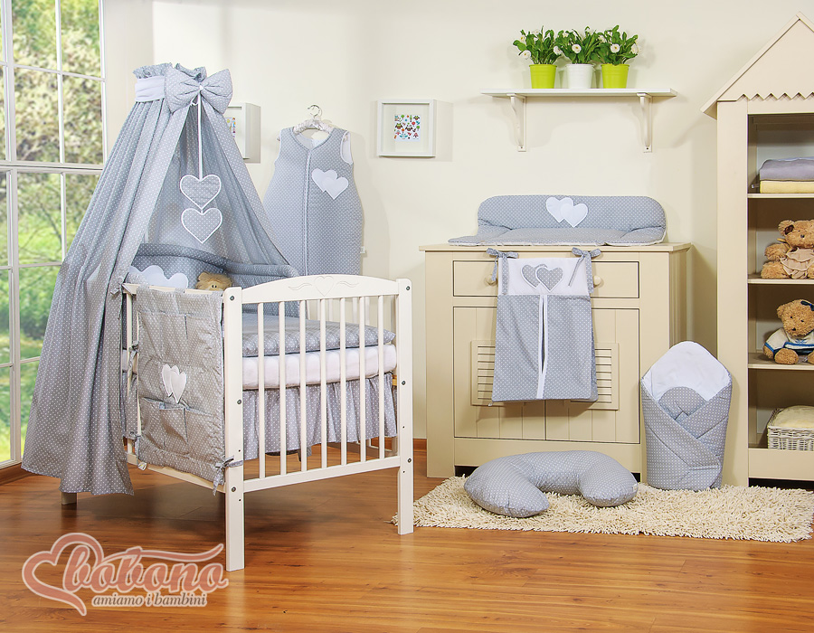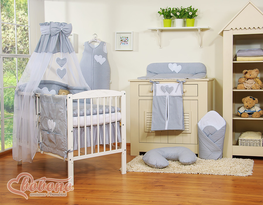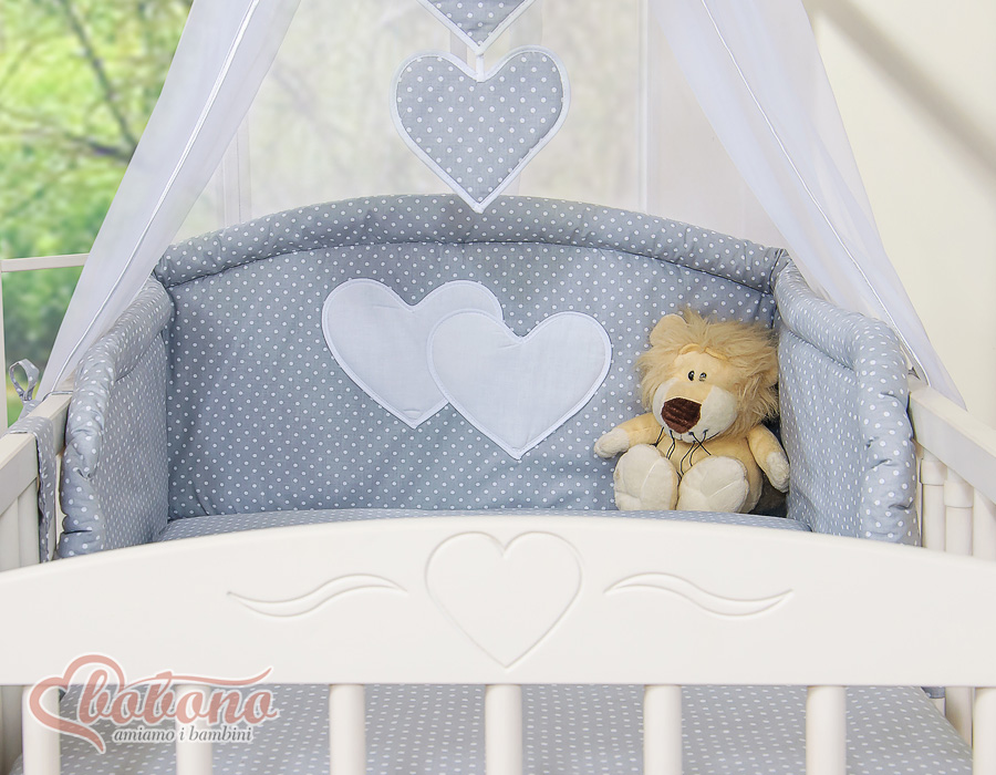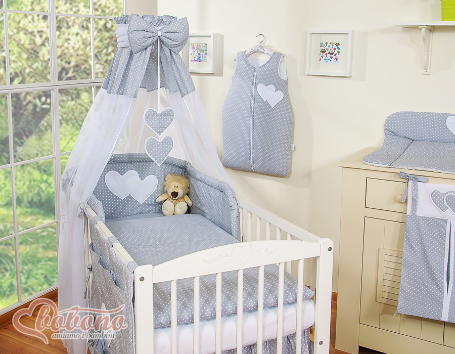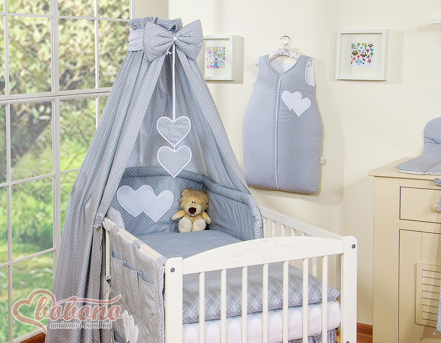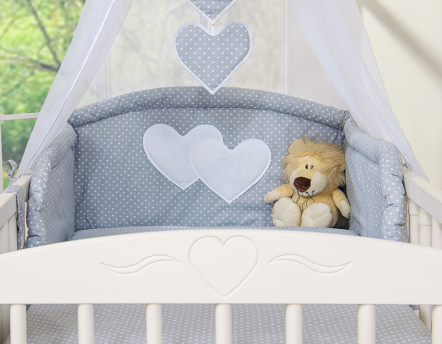 Stubenwagen » Bettwäsche für Babys » Bettwäsche für Babybett HERZEN » Bettwäsche Sets für Babybett 120cm » Bettwäsche Set 11-tlg mit Himmel » Bettwäsche Set 11 Teiliges mit Himmel - Hängende Herzen Grau-Punktemuster