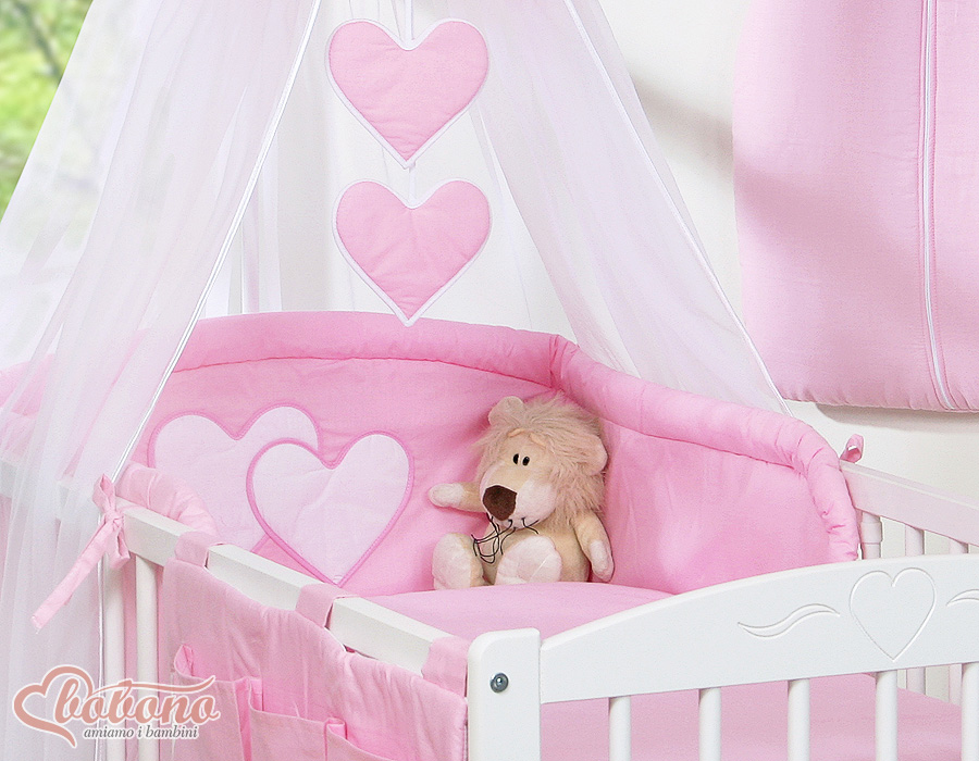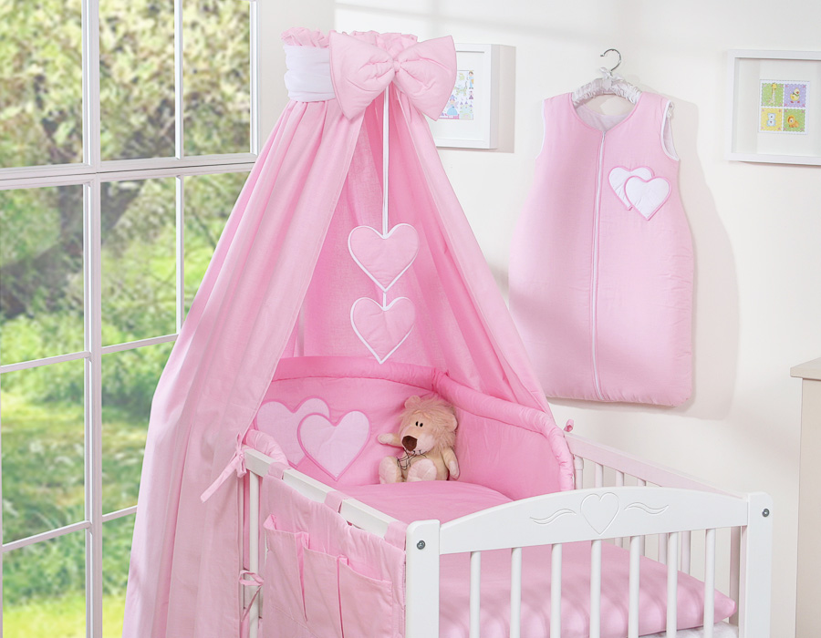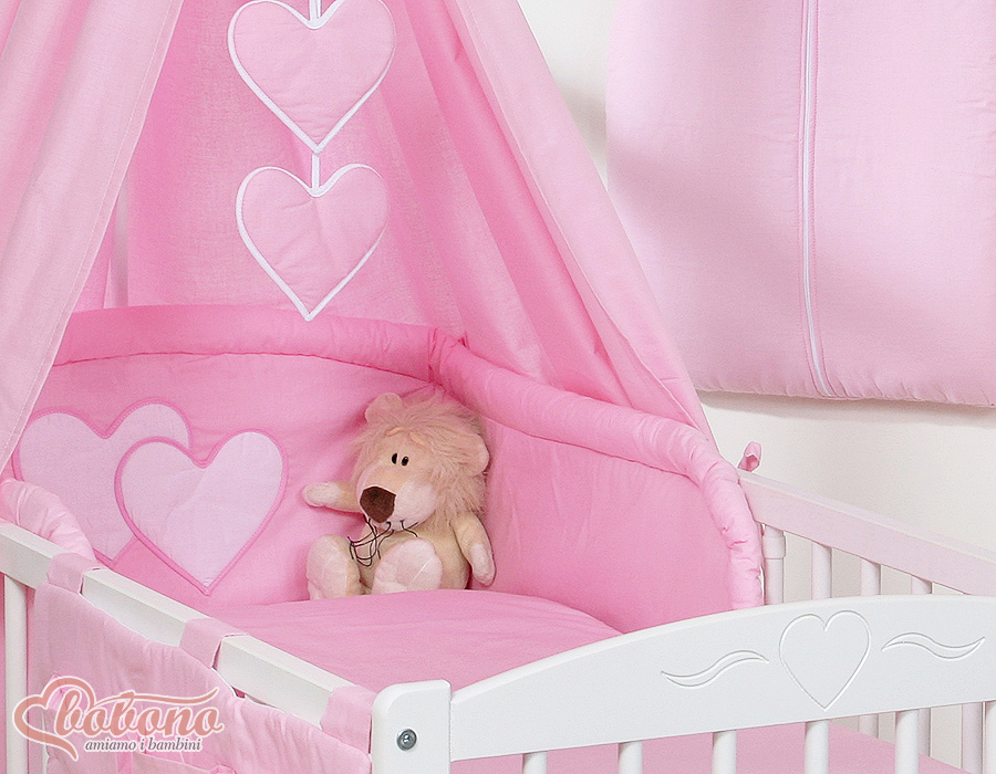 Stubenwagen » Bettwäsche für Babys » Bettwäsche für Babybett HERZEN » Bettwäsche Sets für Babybett 120cm » Bettwäsche Set 11-tlg mit Himmel » Bettwäsche Set 11-tlg mit Himmel - Hängende Herzen rosa