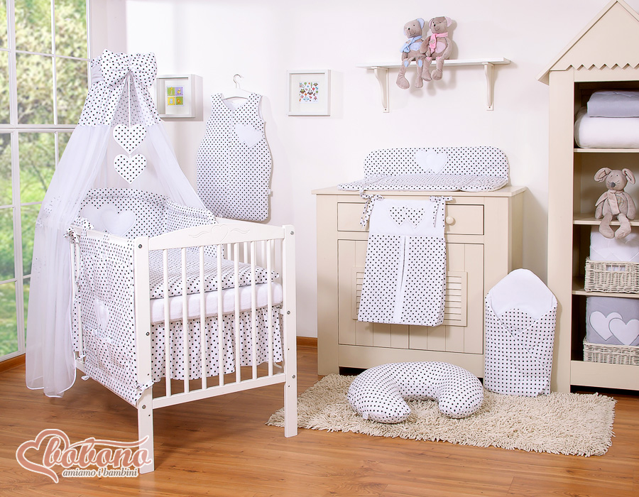 Stubenwagen » Bettwäsche für Babys » Bettwäsche für Babybett HERZEN » Bettwäsche Sets für Babybett 140cm » Bettwäsche Set 11-tlg mit Himmel » Bettwäsche Set 11-tlg mit Himmel - Hängende Herzen Schwarz-Punktemuster