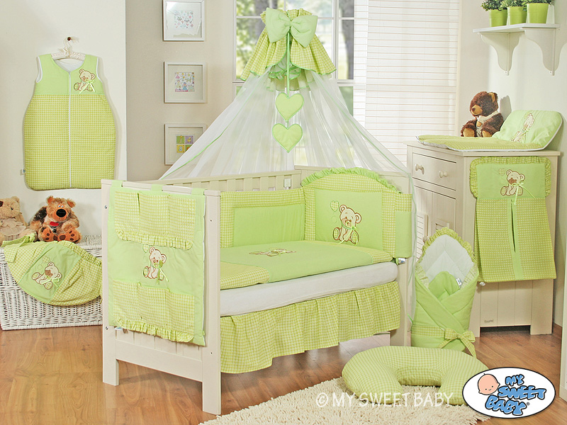 Stubenwagen » Bettwäsche für Babys » Bettwäsche für Babybett BÄR MIT SCHLEIFE » Bettwäsche Sets für Babybett 140cm » Bettwäsche Set 11-tlg mit Moskitonetz » Bettwäsche Set 11-tlg mit Mositonetz - Bär mit Schleife grün