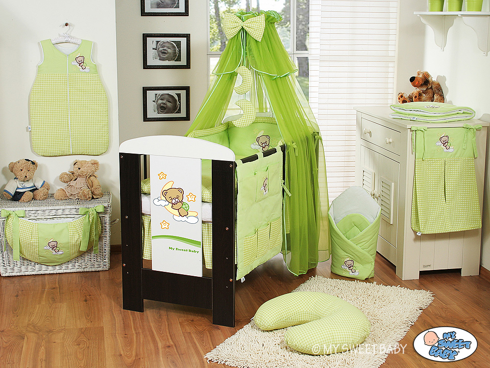 Stubenwagen » Bettwäsche für Babys » Bettwäsche für Babybett GUTE NACHT » Bettwäsche Sets für Babybett 120cm » Bettwäsche Set 11-tlg mit Moskitonetz (S) » Bettwäsche Set 11-tlg mit Moskitinetz (S60) - Gute Nacht grün