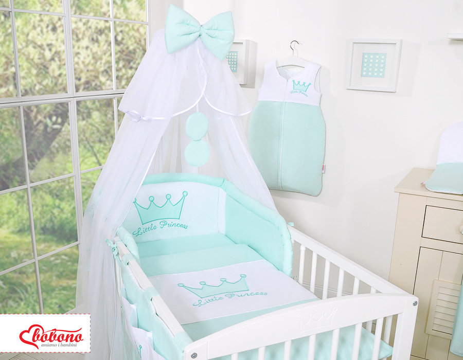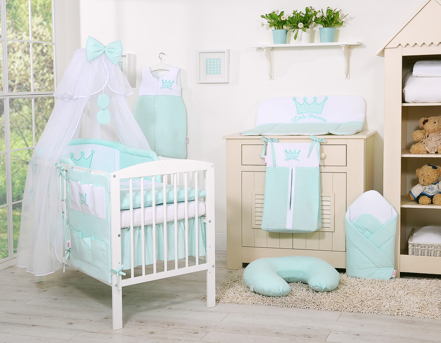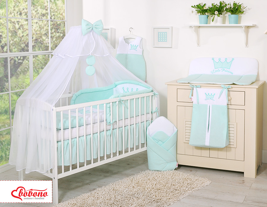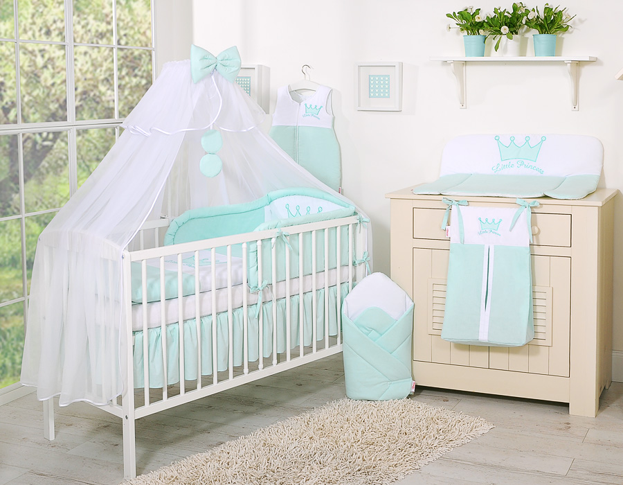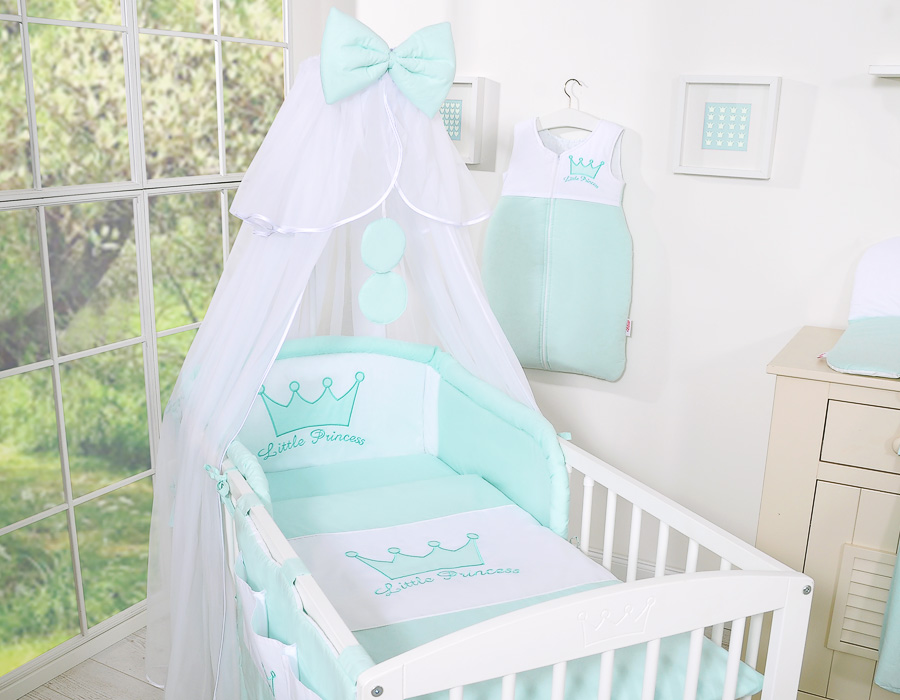Stubenwagen » Bettwäsche für Babys » Bettwäsche für Babybett Kollektion LITTLE PRINCE / PRINCESS » Bettwäsche Sets für Babybett 120cm » Bettwäsche Set 11-tlg mit Moskitonetz » Bettwäsche Set 11-tlg mit Moskitonetz - Little Prince/Princess minze