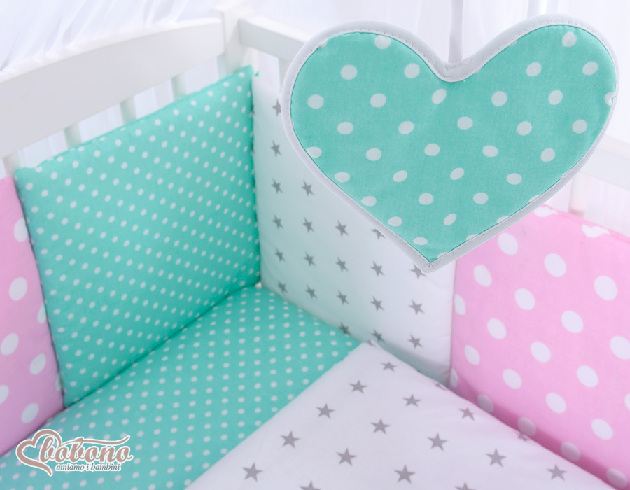 3-8. Universal Babybett Kopfschutz 6tlg - besteht aus 6 Kissen aus Baumwolle(32x32cm) mit Füllung aus Silikongewebe. Füllung und Oberstoff zusammengenäht. Sowohl die Baumwolle,  als auch die Füllung sind von Ökotex getestet. Die Kissen können auch als Spielmatte benutzt werden.