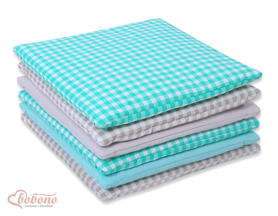 3-8. Universal Babybett Kopfschutz 6tlg - besteht aus 6 Kissen aus Baumwolle(32x32cm) mit Füllung aus Silikongewebe. Füllung und Oberstoff zusammengenäht. Sowohl die Baumwolle,  als auch die Füllung sind von Ökotex getestet. Die Kissen können auch als Spielmatte benutzt werden.