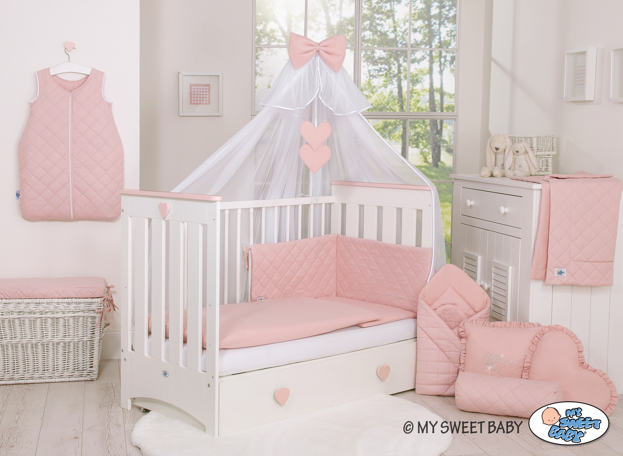 Stubenwagen » Bettwäsche für Babys » Babybett Bettwäsche PIK » Bettwäsche Set 5-tlg mit Moskitonetz » Bettwäsche Set 5-tlg mit Moskitonetz Babybett Kopfschutz gesteppt- altrosa