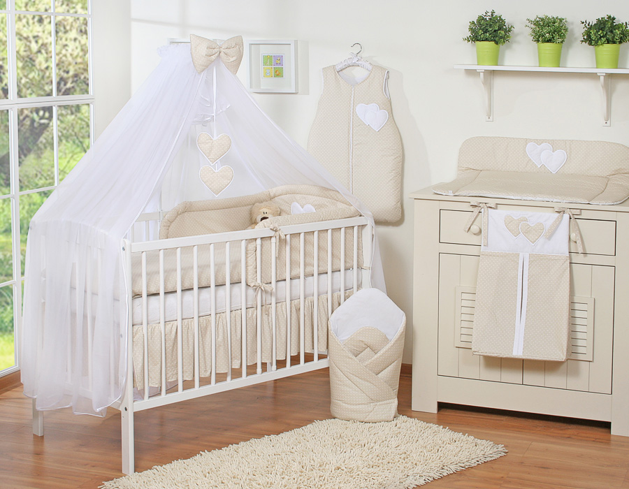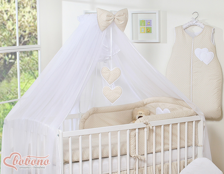 Stubenwagen » Bettwäsche für Babys » Bettwäsche für Babybett HERZEN » Bettwäsche Sets für Babybett 120cm » Bettwäsche Set 5-tlg mit Moskitonetz » Bettwäsche-Set 5-tlg mit Moskitonetz - Hängende Herzen Beige - Punktemuster
