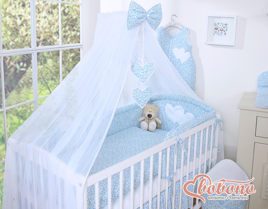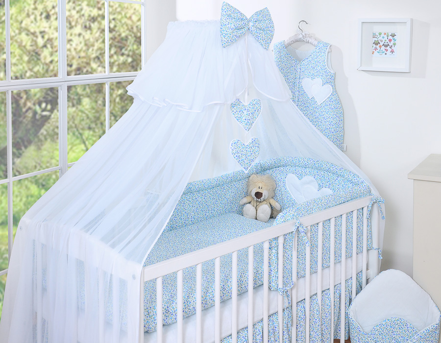 Stubenwagen » Bettwäsche für Babys » Bettwäsche für Babybett HERZEN » Bettwäsche Sets für Babybett 120cm » Bettwäsche Set 5-tlg mit Moskitonetz » Bettwäsche-Set 5-tlg mit Moskitonetz - Hängende Herzen blaue Blümchen