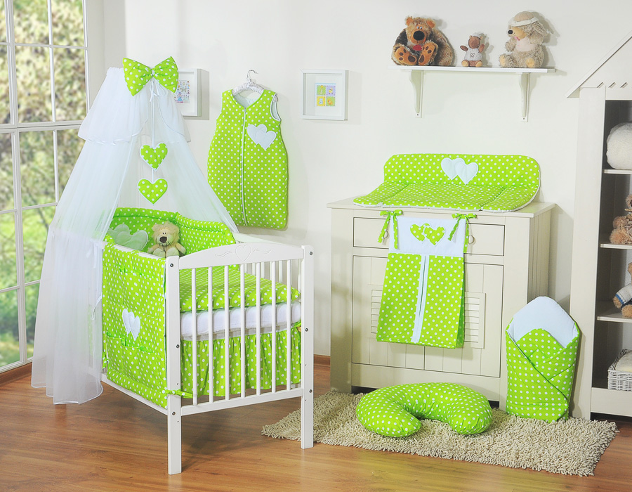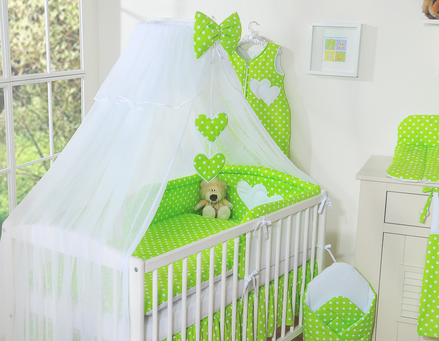 Stubenwagen » Bettwäsche für Babys » Bettwäsche für Babybett HERZEN » Bettwäsche Sets für Babybett 120cm » Bettwäsche Set 5-tlg mit Moskitonetz » Bettwäsche-Set 5-tlg mit Moskitonetz - Hängende Herzen Grün-Punktemuster
