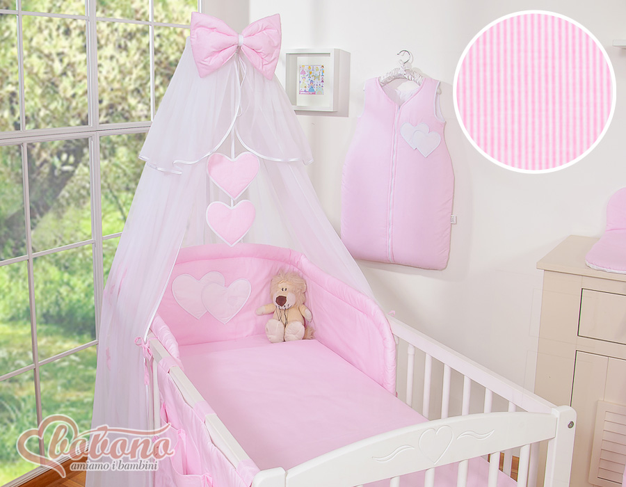 Stubenwagen » Bettwäsche für Babys » Bettwäsche für Babybett HERZEN » Bettwäsche Sets für Babybett 120cm » Bettwäsche Set 5-tlg mit Moskitonetz » Bettwäsche-Set 5-tlg mit Moskitonetz - Hängende Herzen Rosa gestreift