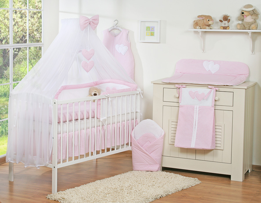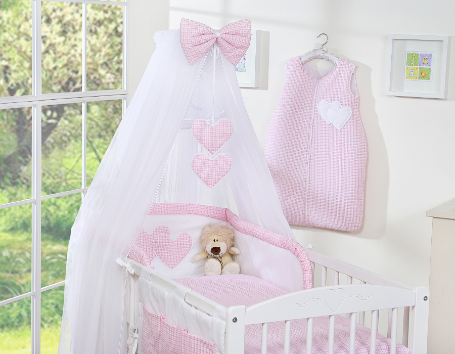 Stubenwagen » Bettwäsche für Babys » Bettwäsche für Babybett HERZEN » Bettwäsche Sets für Babybett 120cm » Bettwäsche Set 5-tlg mit Moskitonetz » Bettwäsche-Set 5-tlg mit Moskitonetz - Hängende Herzen rosa kariert