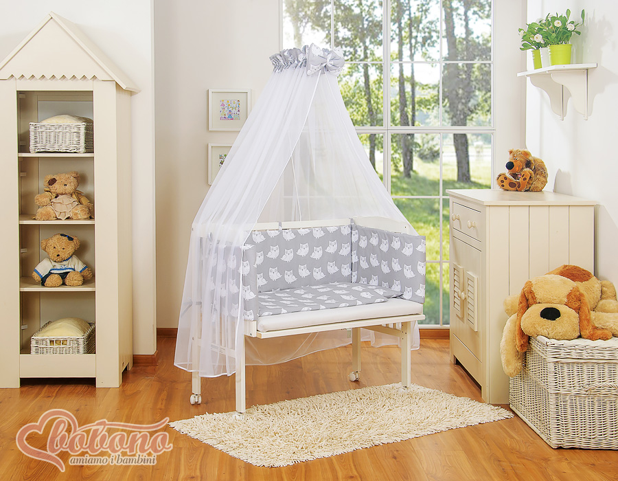Bettwäsche Set 6tlg für Beistellbett FABIO - Basic graue Eulen Wir präsentieren Ihnen ein wunderschönes Bettset für Beistellbettchen. Unsere Stoffe sind zertifiziert, für Baby´s unbedenklich.