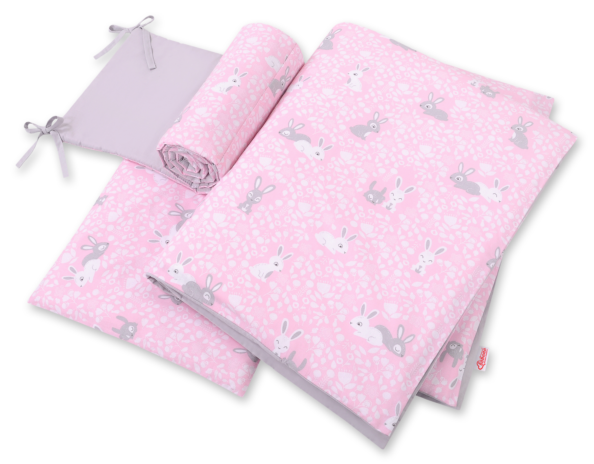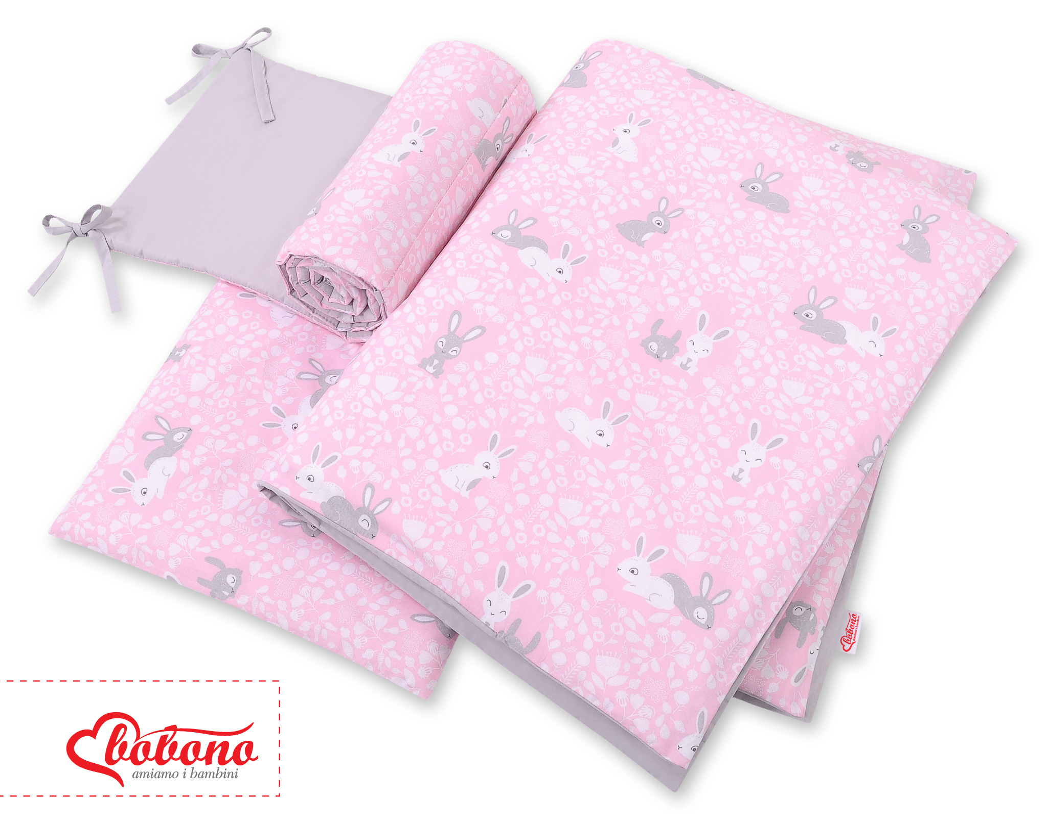 Stubenwagen » Bettwäsche für Babys » Bettwäsche für Babybett FUN & JOY » Bettwäsche Sets für Babybett 120cm » Bettwäsche Set 3-tlg » Bettwäsche Set für Babybett 3-tlg - doppelseitig - rosa Hasen/grau