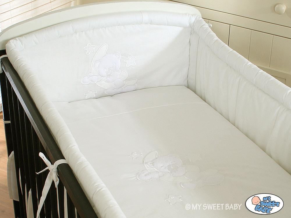3. Uniwersalny ochraniacz na szczebelki 40x420cm zagłówek jest wyższy - 40 cm, lekko zaokrąglony, lepiej dopasowuje się do każdego łóżeczka. Zagłówek ozdobiony dużym haftem ze słodkim misiem śpiącym na księżycu. Ochraniacz wypełniony jest grubą warstwą sprężystej włókniny silikonowej, antyalergicznej. Włóknina posiada certyfikat Ökotex. Odpowiednio skrojony und uszyty, z dodatkowymi przepikowaniami na zagłówku und po bokach, z długimi mocnymi troczkami z tej samej tkaniny, nasz ochraniacz ładnie się układa na łóżeczku nawet po wielu praniach.