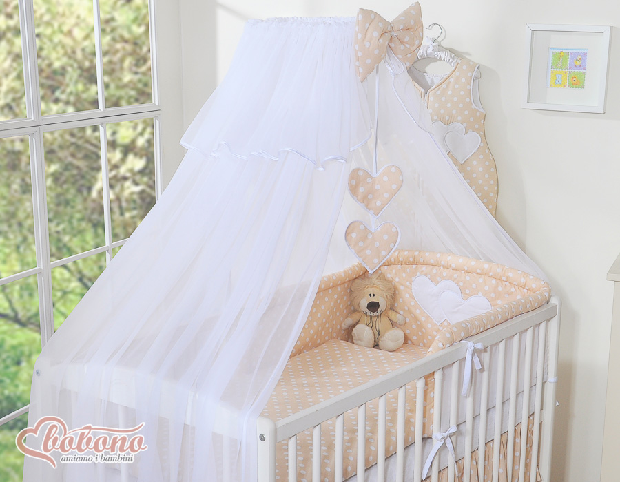Stubenwagen » Bettwäsche für Babys » Bettwäsche für Babybett HERZEN » Bettwäsche Sets für Babybett 120cm » Bettwäsche Set 11-tlg mit Moskitonetz » Bettwäscheset 11-tlg mit Moskitonetz - Hängende Herzen Beige-Punktemuster
