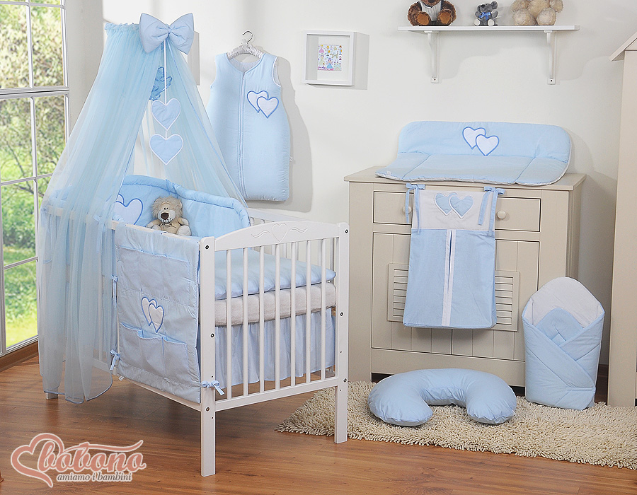 Stubenwagen » Bettwäsche für Babys » Bettwäsche für Babybett HERZEN » Bettwäsche Sets für Babybett 120cm » Bettwäsche Set 11-tlg mit Moskitonetz » Bettwäscheset 11-tlg mit Moskitonetz - Hängende Herzen blau