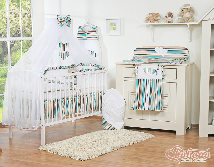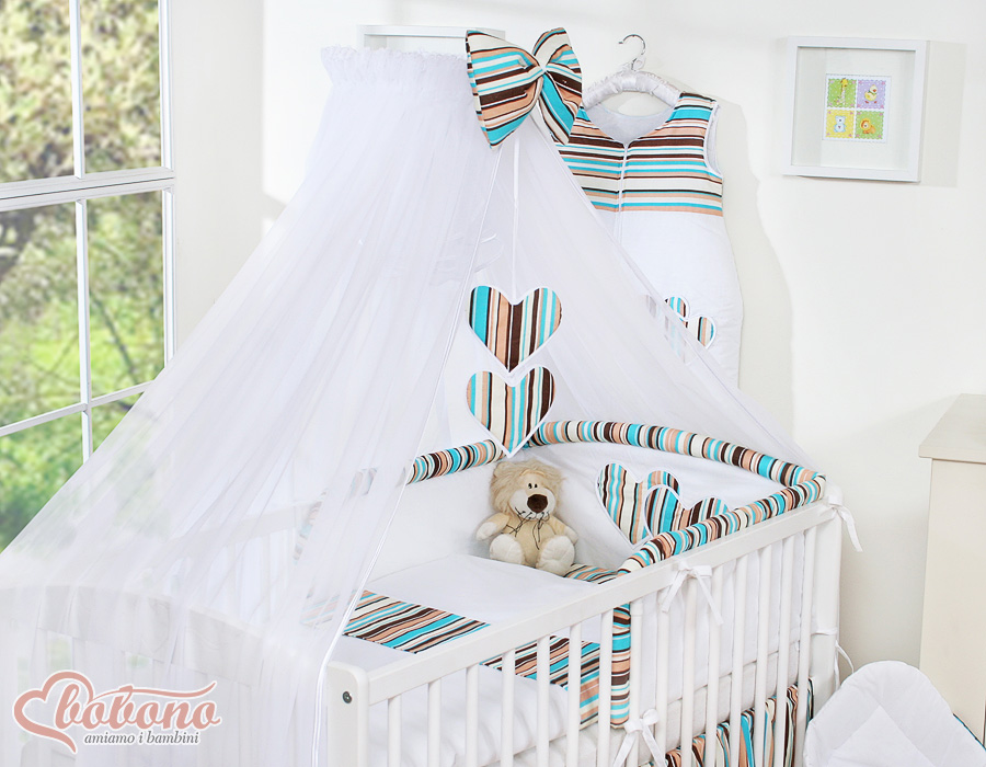 Stubenwagen » Bettwäsche für Babys » Bettwäsche für Babybett HERZEN » Bettwäsche Sets für Babybett 140cm » Bettwäsche Set 11-tlg mit Moskitonetz » Bettwäscheset 11-tlg mit Moskitonetz - Hängende Herzen braun gestreift