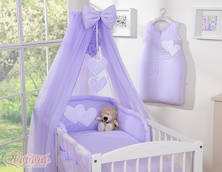 Stubenwagen » Bettwäsche für Babys » Bettwäsche für Babybett HERZEN » Bettwäsche Sets für Babybett 140cm » Bettwäsche Set 11-tlg mit Moskitonetz » Bettwäscheset 11-tlg mit Moskitonetz - Hängende Herzen lila