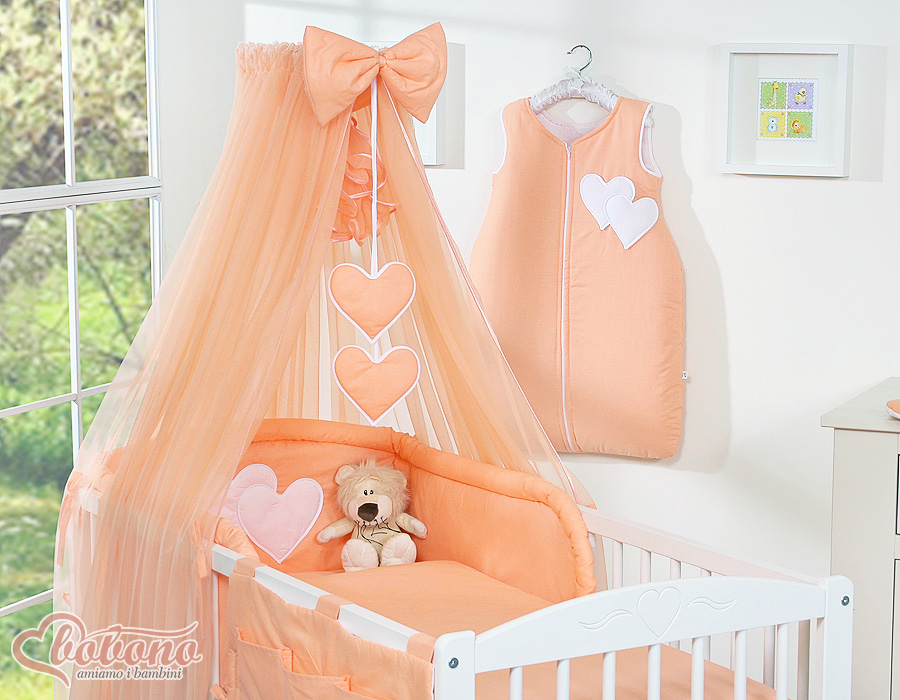 Stubenwagen » Bettwäsche für Babys » Bettwäsche für Babybett HERZEN » Bettwäsche Sets für Babybett 140cm » Bettwäsche Set 11-tlg mit Moskitonetz » Bettwäscheset 11-tlg mit Moskitonetz - Hängende Herzen pfirsich