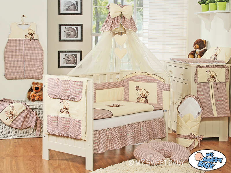 Stubenwagen » Bettwäsche für Babys » Bettwäsche für Babybett BÄR MIT SCHLEIFE » Bettwäsche Sets für Babybett 120cm » Bettwäsche Set 11-tlg mit Moskitonetz » Bettwäscheset 11-tlg Mositonetz mit Stange für Babybett 60x120cm - Bär mit Schleife braun