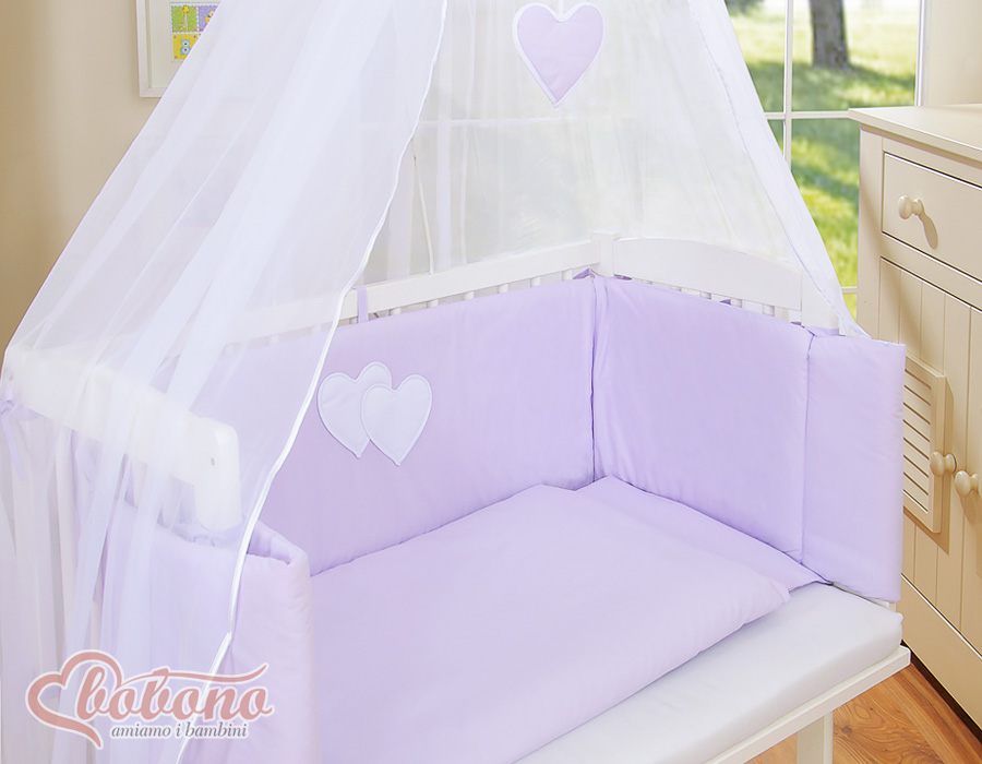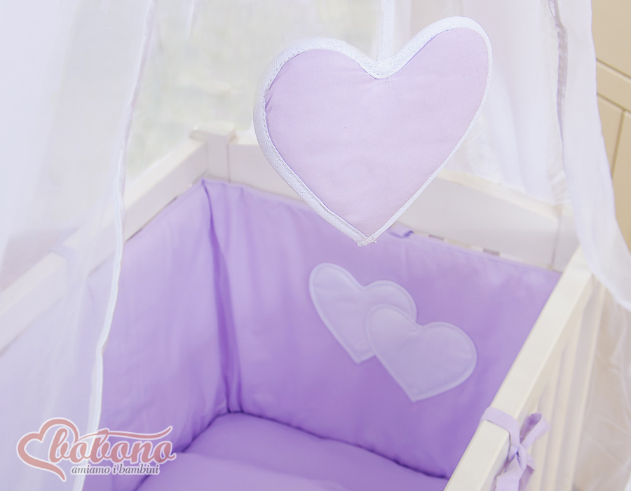 Bettwäscheset 6-tlg für Beistellbett FABIO - Hängende Herzen lila Wir präsentieren Ihnen ein wunderschönes Bettset für Beistellbettchen. Unsere Stoffe sind zertifiziert, für Baby´s unbedenklich. Das Set beinhaltet: