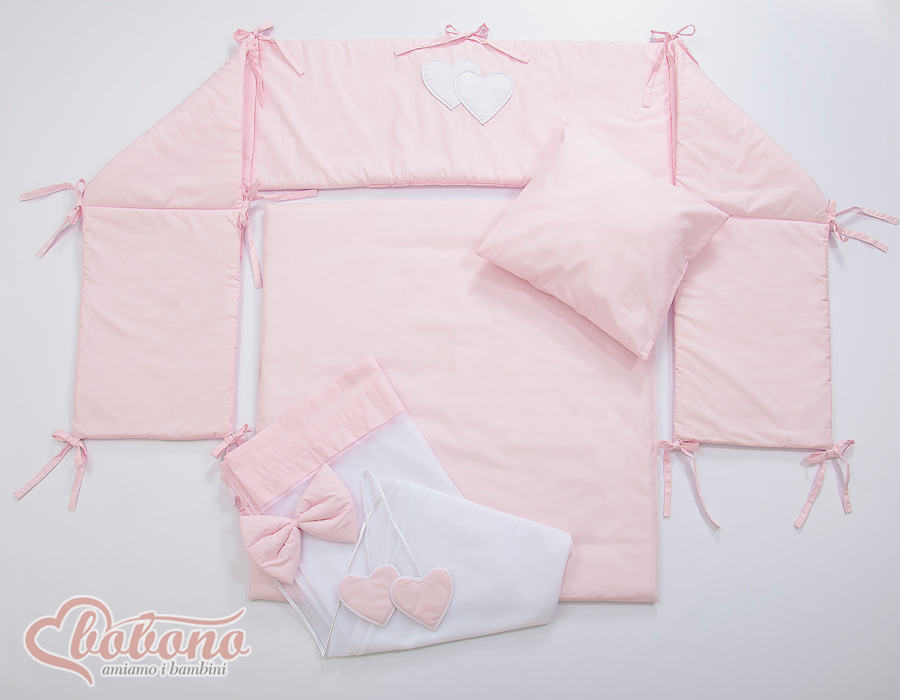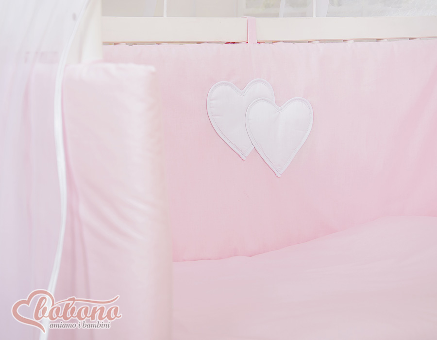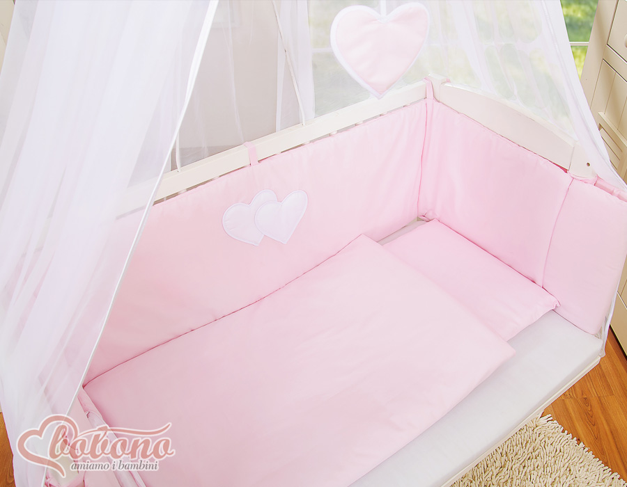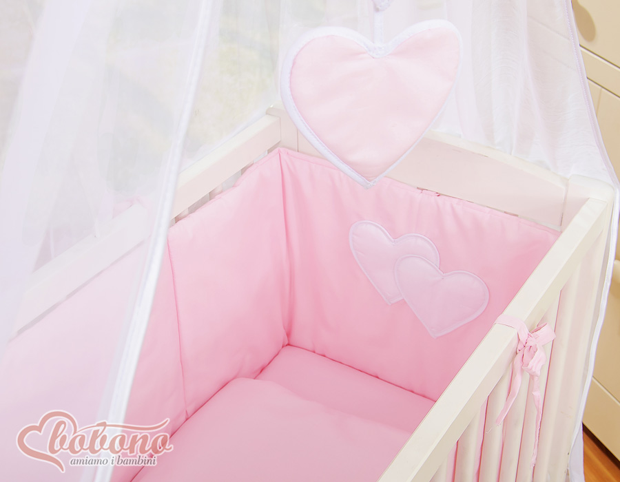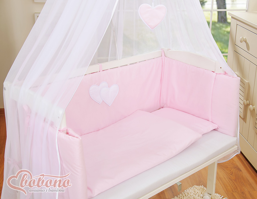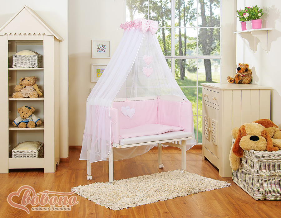 Bettwäscheset 6tlg für Beistellbett FABIO - Hängende Herzen rosa Wir präsentieren Ihnen ein wunderschönes Bettset für Beistellbettchen. Unsere Stoffe sind zertifiziert, für Baby´s unbedenklich.