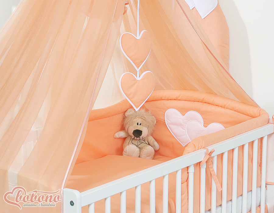 Stubenwagen » Bettwäsche für Babys » Bettwäsche für Babybett HERZEN » Bettwäsche Sets für Babybett 120cm » Bettwäsche Set 11-tlg mit Moskitonetz » Bettwäscheset Babybett 11-tlg mit Moskitonetz - Hängende Herzen pfirsich