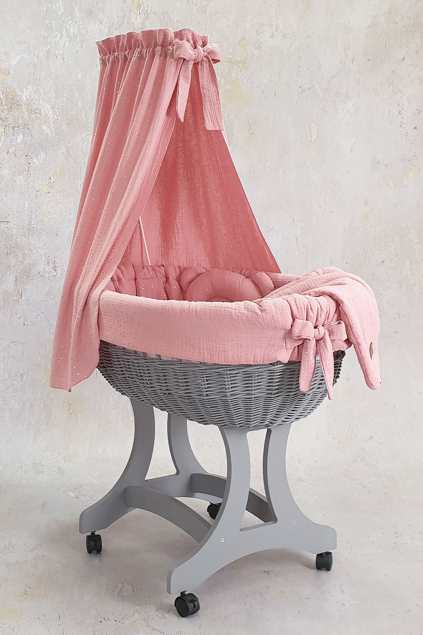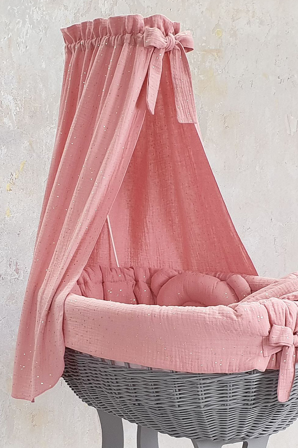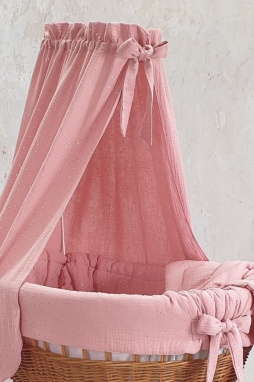 Bezug für Stubenwagen mit Himmel in Puderrosa mit goldenen Punkten