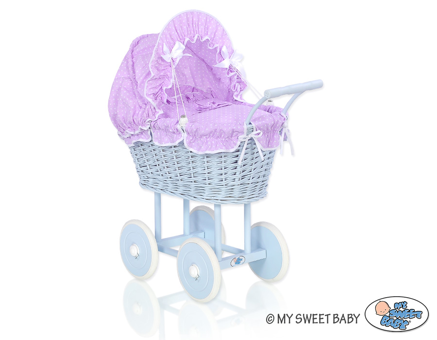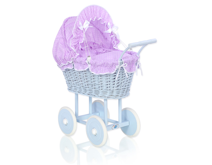 Stubenwagen » Spielzeug Kuscheltiere » Puppenwagen und Spielzeug » Puppenwagen aus Weide » Blau Weide Puppenwagen Korb Bettwäsche Lila mit Weiß Punktmuster