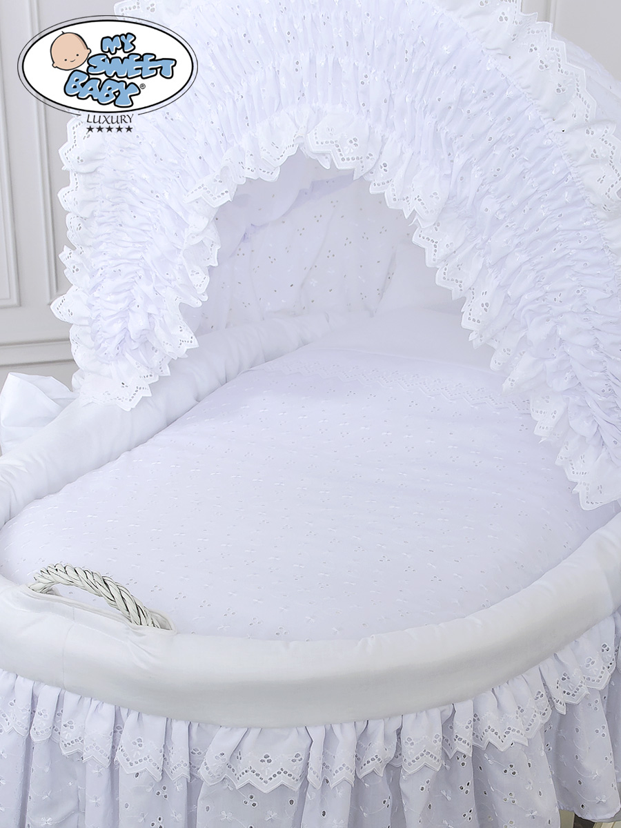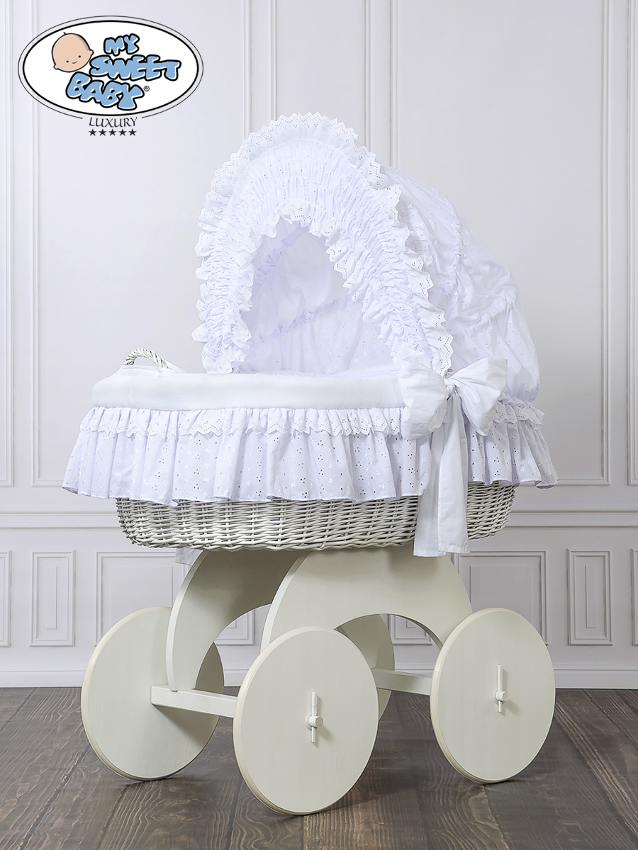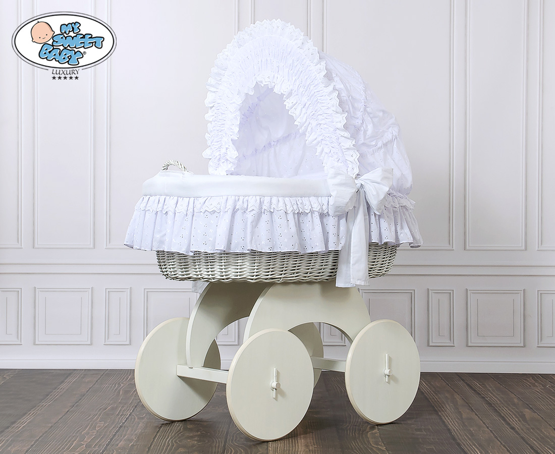 Ein wunderschöner handgemachter Stubenwagen, der ein gemütliches, Nest bildet. Weiße Farbe von Korb und Holz.