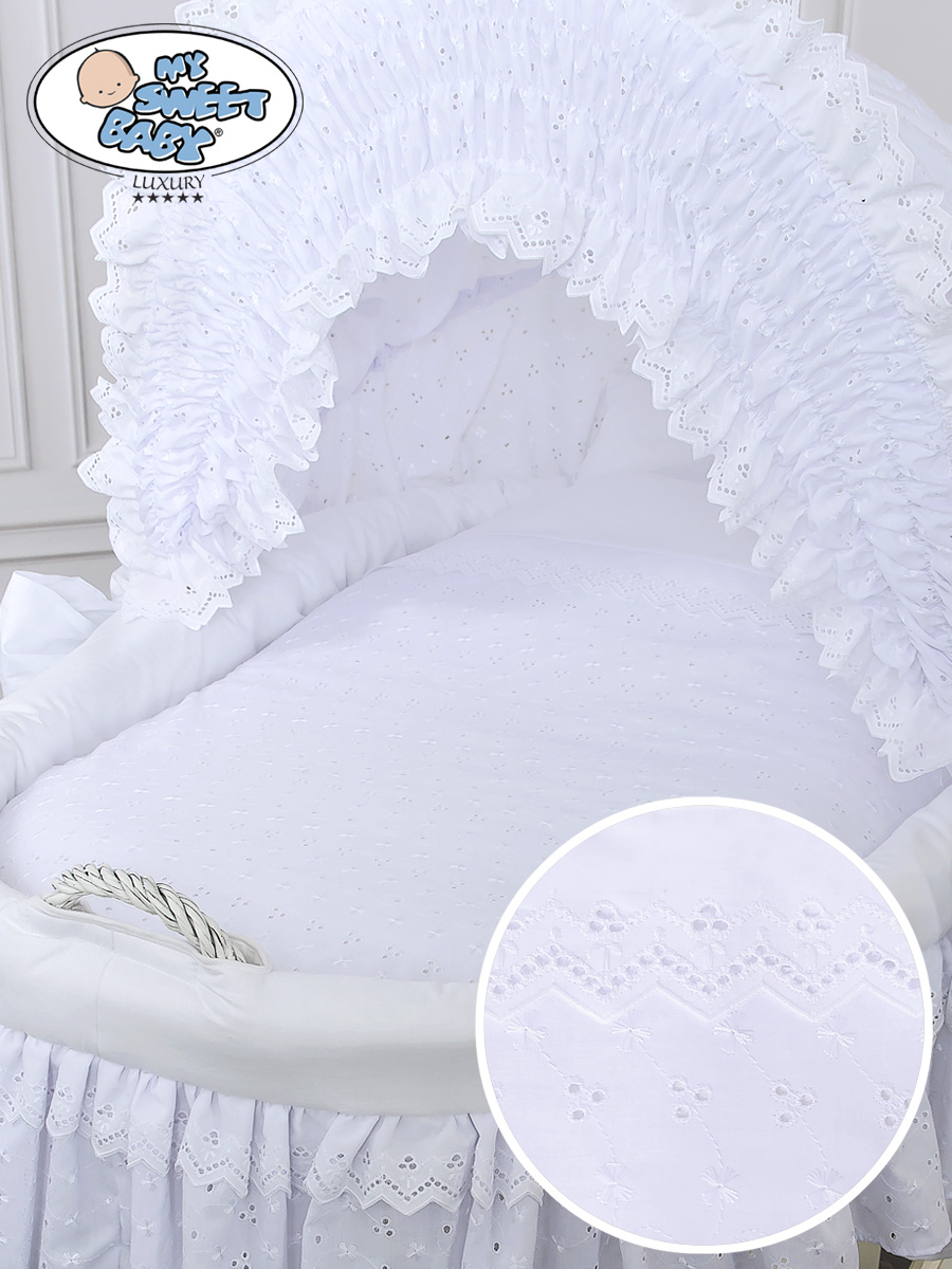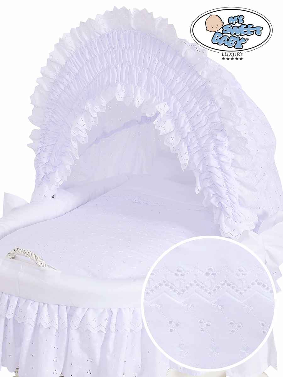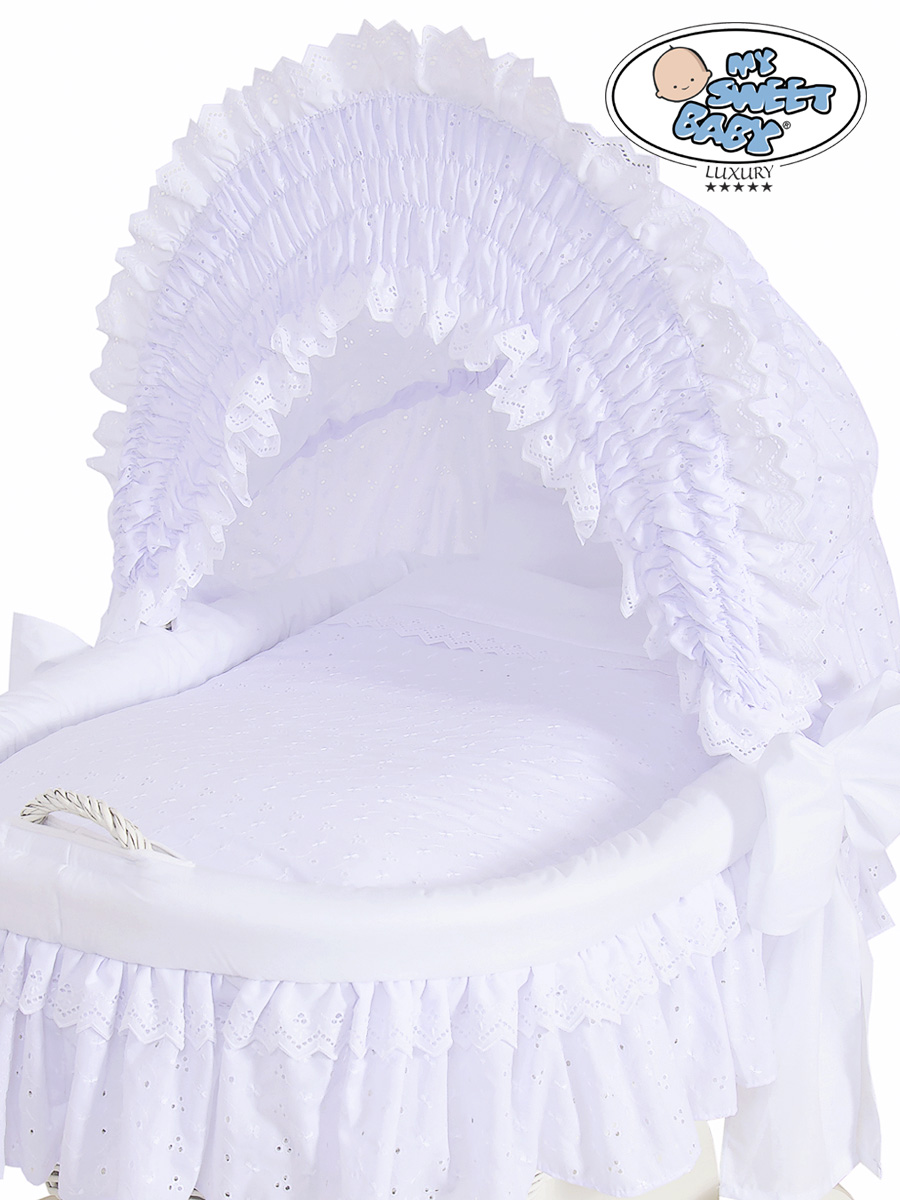 Ein wunderschöner handgemachter Stubenwagen, der ein gemütliches, Nest bildet. Weiße Farbe von Korb und Holz.