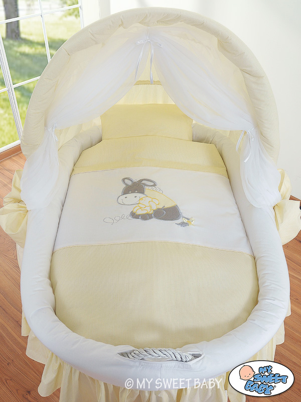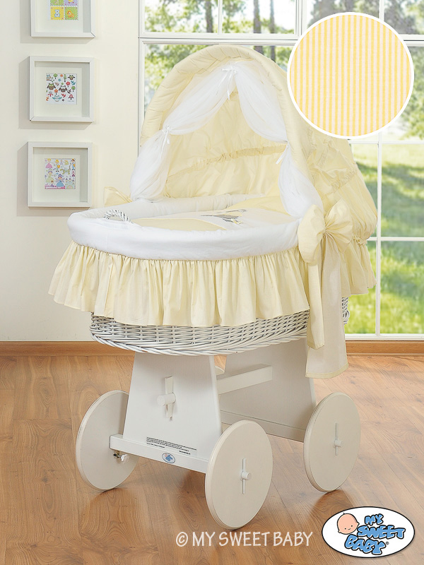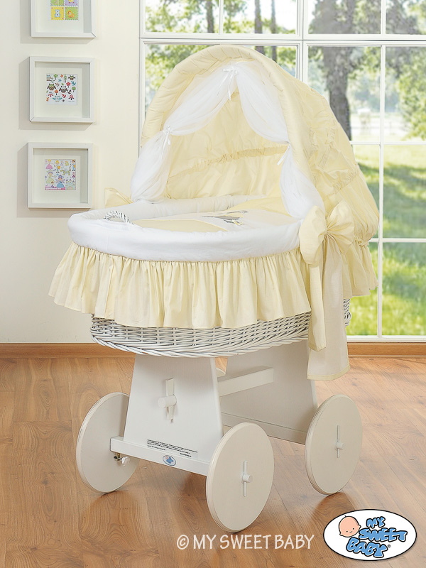 • Fahrgestell aus echtem Holz. SEHR STABIL! Höheres Untergestell als bei den anderen Herrsteller - 50cm. Es ist sehr bequem zum benutzen, weil man sich nicht so bücken muss. • Das Untergestell ist weiß lackiert mit ökologischen Farben, Große Leichtlaufrädern aus vollem Holz (Durchmesser 30 cm) mit weißen Gummireifen, die sich sehr leicht drehen. Sehr leise auch auf den Parkett, oder Fliesen • Der Korb ist aus Weide durch Handarbeit gefertigt. MEGA GROßE LIEGEFLÄCHE 80cmx45cm, daher länger Nutzbar. • Der Griff beim Korb ermöglicht den Wagen leicht umzustellen. • Das spezielle Haubenmechanismus erlaubt die Haube in alle Positionen aufzustellen. Er ist auf Dauer an den Korb befestigt und die ausgewählte Elemente können sehr leicht abmontiert werden. Dadurch kann der Haubenbezug leicht zum waschen abgenommen werden und ist wieder leicht zurück anzubringen. • Auf jedem Korb liegt eine kuschelige in Baumwolle eingenähte Vliesschicht (2 cm dick). Das macht aus dem Korb ein weiches Nestchen, dass die Geräusche dämpft, und wo Eures Kind geborgen schlafen kann. Das Sortiment enthält auch ein Kissen (35x37cm) und eine Decke (78x78cm) mit einer speziellen Ausfüllung aus Polyestergewebe - bieten einen optimalen Schlafkomfort, sind sehr gesund und werden für die Babys und Allergiker empfohlen. Decke und Kissen in den selben Farben wie der Korbbezug. Alle Elemente können in der Waschmaschine gewaschen werden. • In die Standardaustattung wird zusätzlich eine Matratze aus Pressvlies dazugegeben. Sie ist 4 cm hoch, oval, luftdurchlässig mit einem abnehmbaren, gesteppten Bezug - Waschbar bis 40 Grad. Creme Luca Esel Haube Bettset Bollerwagen