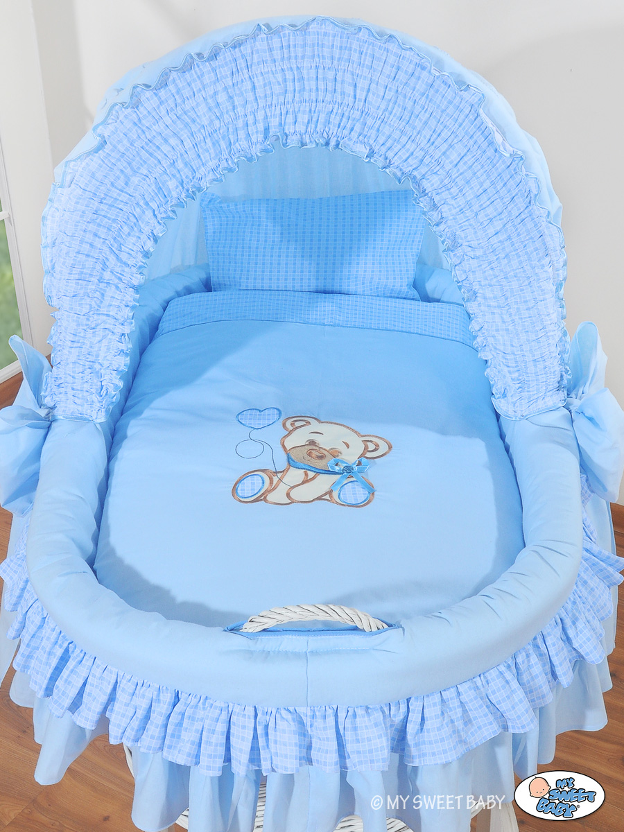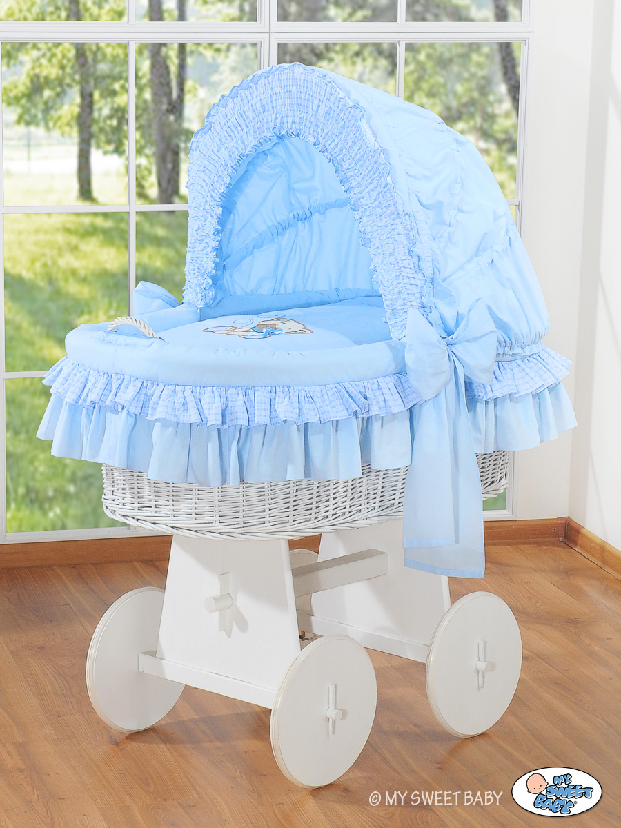 • Fahrgestell aus echtem Holz. SEHR STABIL! Höheres Untergestell als bei den anderen Herrsteller - 50cm. Es ist sehr bequem zum benutzen, weil man sich nicht so bücken muss. • Das Untergestell ist weiß lackiert mit ökologischen Farben, Große Leichtlaufrädern aus vollem Holz (Durchmesser 30 cm) mit weißen Gummireifen, die sich sehr leicht drehen. Sehr leise auch auf den Parkett, oder Fliesen • Der Korb ist aus Weide durch Handarbeit gefertigt. MEGA GROßE LIEGEFLÄCHE 80cmx45cm, daher länger Nutzbar. • Der Griff beim Korb ermöglicht den Wagen leicht umzustellen. • Das spezielle Haubenmechanismus erlaubt die Haube in alle Positionen aufzustellen. Er ist auf Dauer an den Korb befestigt und die ausgewählte Elemente können sehr leicht abmontiert werden. Dadurch kann der Haubenbezug leicht zum waschen abgenommen werden und ist wieder leicht zurück anzubringen. • Auf jedem Korb liegt eine kuschelige in Baumwolle eingenähte Vliesschicht (2 cm dick). Das macht aus dem Korb ein weiches Nestchen, dass die Geräusche dämpft, und wo Eures Kind geborgen schlafen kann. Das Sortiment enthält auch ein Kissen (35x37cm) und eine Decke (78x78cm) mit einer speziellen Ausfüllung aus Polyestergewebe - bieten einen optimalen Schlafkomfort, sind sehr gesund und werden für die Babys und Allergiker empfohlen. Decke und Kissen in den selben Farben wie der Korbbezug. Alle Elemente können in der Waschmaschine gewaschen werden. • In die Standardaustattung wird zusätzlich eine Matratze aus Pressvlies dazugegeben. Sie ist 4 cm hoch, oval, luftdurchlässig mit einem abnehmbaren, gesteppten Bezug - Waschbar bis 40 Grad. Blau Schleife Bär Haube Bollerwagen