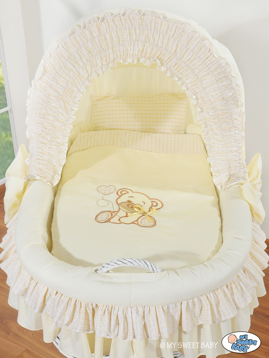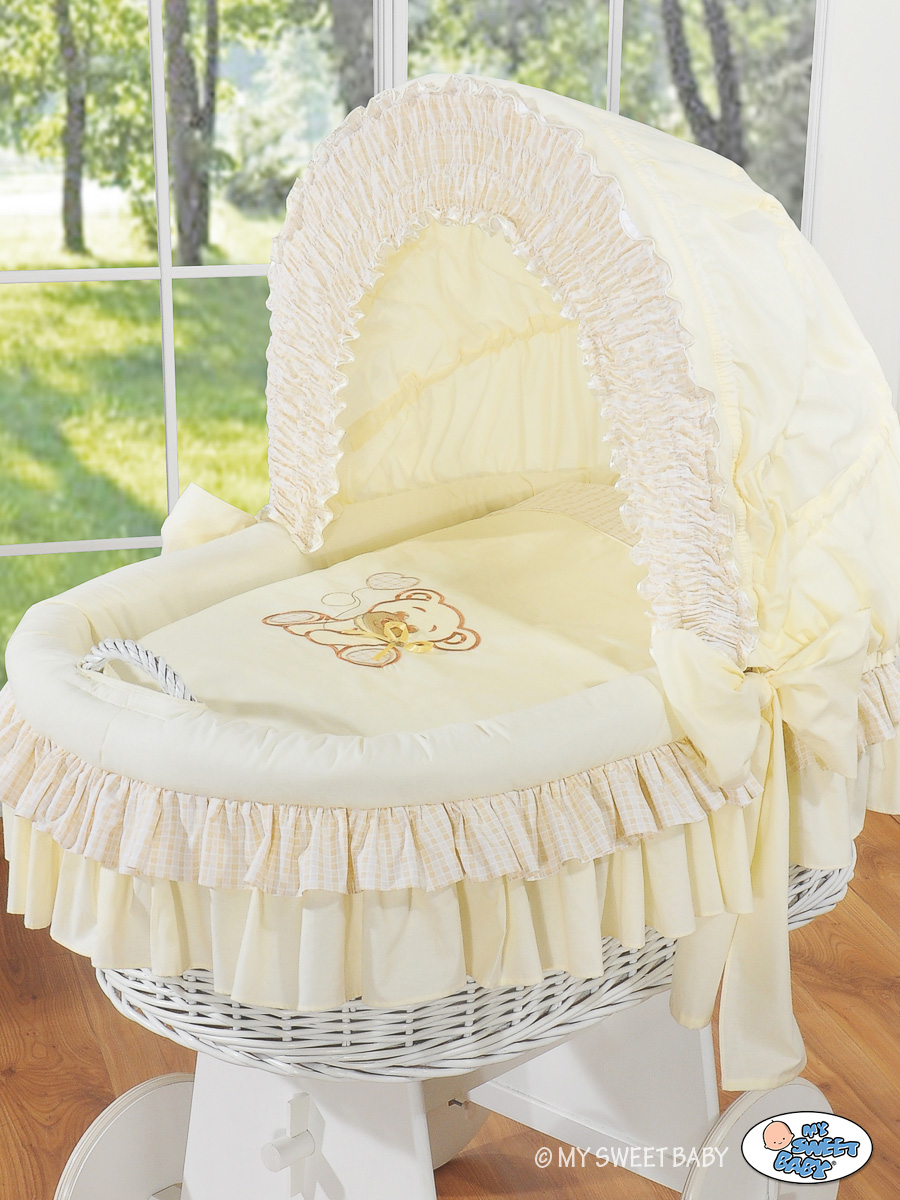 • Fahrgestell aus echtem Holz. SEHR STABIL! Höheres Untergestell als bei den anderen Herrsteller - 50cm. Es ist sehr bequem zum benutzen, weil man sich nicht so bücken muss. • Das Untergestell ist weiß lackiert mit ökologischen Farben, Große Leichtlaufrädern aus vollem Holz (Durchmesser 30 cm) mit weißen Gummireifen, die sich sehr leicht drehen. Sehr leise auch auf den Parkett, oder Fliesen • Der Korb ist aus Weide durch Handarbeit gefertigt. MEGA GROßE LIEGEFLÄCHE 80cmx45cm, daher länger Nutzbar. • Der Griff beim Korb ermöglicht den Wagen leicht umzustellen. • Das spezielle Haubenmechanismus erlaubt die Haube in alle Positionen aufzustellen. Er ist auf Dauer an den Korb befestigt und die ausgewählte Elemente können sehr leicht abmontiert werden. Dadurch kann der Haubenbezug leicht zum waschen abgenommen werden und ist wieder leicht zurück anzubringen. • Auf jedem Korb liegt eine kuschelige in Baumwolle eingenähte Vliesschicht (2 cm dick). Das macht aus dem Korb ein weiches Nestchen, dass die Geräusche dämpft, und wo Eures Kind geborgen schlafen kann. Das Sortiment enthält auch ein Kissen (35x37cm) und eine Decke (78x78cm) mit einer speziellen Ausfüllung aus Polyestergewebe - bieten einen optimalen Schlafkomfort, sind sehr gesund und werden für die Babys und Allergiker empfohlen. Decke und Kissen in den selben Farben wie der Korbbezug. Alle Elemente können in der Waschmaschine gewaschen werden. • In die Standardaustattung wird zusätzlich eine Matratze aus Pressvlies dazugegeben. Sie ist 4 cm hoch, oval, luftdurchlässig mit einem abnehmbaren, gesteppten Bezug - Waschbar bis 40 Grad. Creme Schleife Bär Haube Bollerwagen