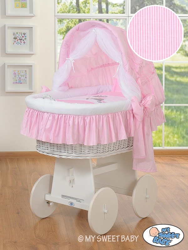 • Fahrgestell aus echtem Holz. SEHR STABIL! Höheres Untergestell als bei den anderen Herrsteller - 50cm. Es ist sehr bequem zum benutzen, weil man sich nicht so bücken muss. • Das Untergestell ist weiß lackiert mit ökologischen Farben, Große Leichtlaufrädern aus vollem Holz (Durchmesser 30 cm) mit weißen Gummireifen, die sich sehr leicht drehen. Sehr leise auch auf den Parkett, oder Fliesen • Der Korb ist aus Weide durch Handarbeit gefertigt. MEGA GROßE LIEGEFLÄCHE 80cmx45cm, daher länger Nutzbar. • Der Griff beim Korb ermöglicht den Wagen leicht umzustellen. • Das spezielle Haubenmechanismus erlaubt die Haube in alle Positionen aufzustellen. Er ist auf Dauer an den Korb befestigt und die ausgewählte Elemente können sehr leicht abmontiert werden. Dadurch kann der Haubenbezug leicht zum waschen abgenommen werden und ist wieder leicht zurück anzubringen. • Auf jedem Korb liegt eine kuschelige in Baumwolle eingenähte Vliesschicht (2 cm dick). Das macht aus dem Korb ein weiches Nestchen, dass die Geräusche dämpft, und wo Eures Kind geborgen schlafen kann. Das Sortiment enthält auch ein Kissen (35x37cm) und eine Decke (78x78cm) mit einer speziellen Ausfüllung aus Polyestergewebe - bieten einen optimalen Schlafkomfort, sind sehr gesund und werden für die Babys und Allergiker empfohlen. Decke und Kissen in den selben Farben wie der Korbbezug. Alle Elemente können in der Waschmaschine gewaschen werden. • In die Standardaustattung wird zusätzlich eine Matratze aus Pressvlies dazugegeben. Sie ist 4 cm hoch, oval, luftdurchlässig mit einem abnehmbaren, gesteppten Bezug - Waschbar bis 40 Grad. Rosa Luca Esel Bettwäsche Haube Bollerwagen