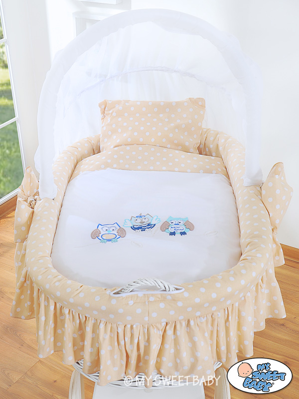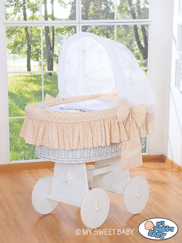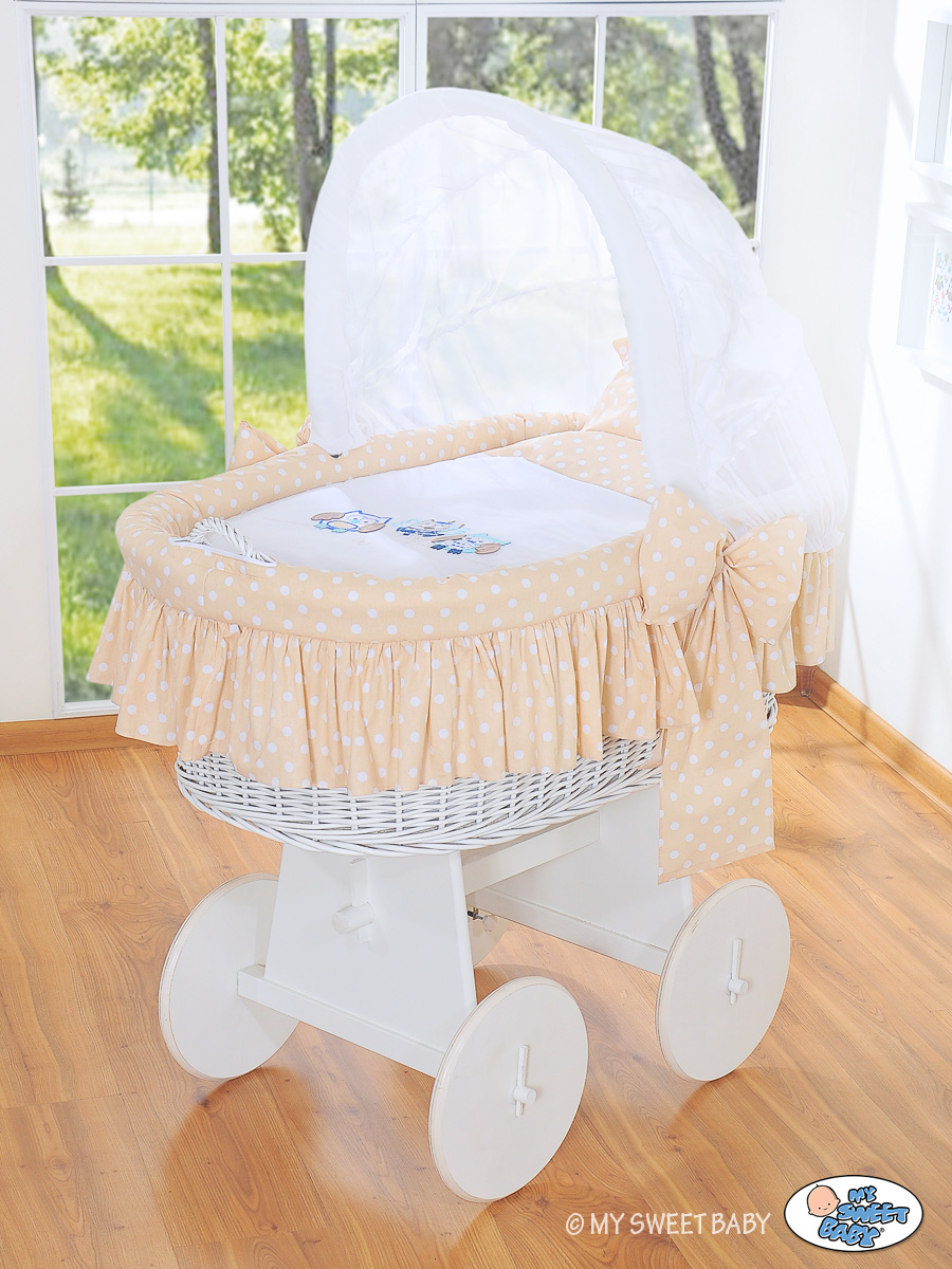 • Fahrgestell aus echtem Holz. SEHR STABIL! Höheres Untergestell als bei den anderen Herrsteller - 50cm. Es ist sehr bequem zum benutzen, weil man sich nicht so bücken muss. • Das Untergestell ist in einer zartbraune Farbe und ist mit einem ökologischen Lack behandelt Große Leichtlaufrädern aus vollem Holz (Durchmesser 30 cm) mit weißen Gummireifen, die sich sehr leicht drehen. Sehr leise auch auf den Parkett, oder Fliesen • Der Korb ist aus Weide durch Handarbeit gefertigt. MEGA GROßE LIEGEFLÄCHE 80cmx45cm, daher länger Nutzbar. • Der Griff beim Korb ermöglicht den Wagen leicht umzustellen. • Das spezielle Haubenmechanismus erlaubt die Haube in alle Positionen aufzustellen. Er ist auf Dauer an den Korb befestigt und die ausgewählte Elemente können sehr leicht abmontiert werden. Dadurch kann der Haubenbezug leicht zum waschen abgenommen werden und ist wieder leicht zurück anzubringen. • Auf jedem Korb liegt eine kuschelige in Baumwolle eingenähte Vliesschicht (2 cm dick). Das macht aus dem Korb ein weiches Nestchen, dass die Geräusche dämpft, und wo Eures Kind geborgen schlafen kann. Das Sortiment enthält auch ein Kissen (35x37cm) und eine Decke (78x78cm) mit einer speziellen Ausfüllung aus Polyestergewebe - bieten einen optimalen Schlafkomfort, sind sehr gesund und werden für die Babys und Allergiker empfohlen. Decke und Kissen in den selben Farben wie der Korbbezug. Alle Elemente können in der Waschmaschine gewaschen werden. • In die Standardaustattung wird zusätzlich eine Matratze aus Pressvlies dazugegeben. Sie ist 4 cm hoch, oval, luftdurchlässig mit einem abnehmbaren, gesteppten Bezug - Waschbar bis 40 Grad. Beige Adele Zibi Bigi Eulen Haube Bollerwagen