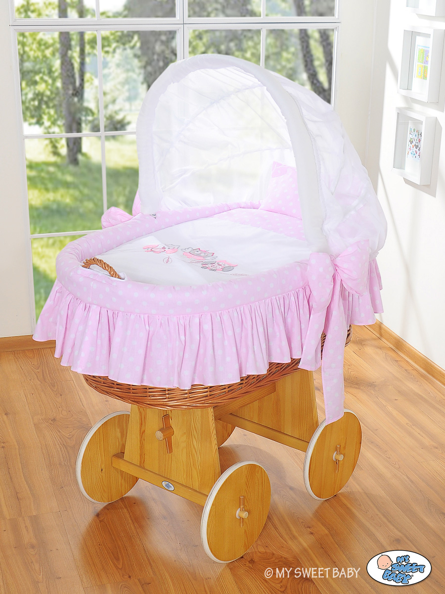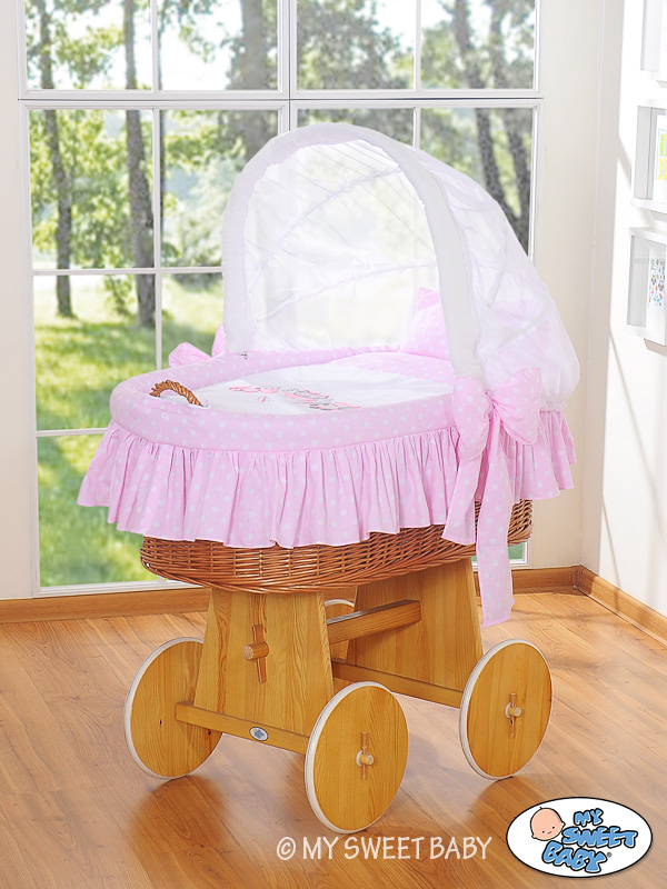 • Fahrgestell aus echtem Holz. SEHR STABIL! Höheres Untergestell als bei den anderen Herrsteller - 50cm. Es ist sehr bequem zum benutzen, weil man sich nicht so bücken muss. • Das Untergestell ist in einer zartbraune Farbe und ist mit einem ökologischen Lack behandelt Große Leichtlaufrädern aus vollem Holz (Durchmesser 30 cm) mit weißen Gummireifen, die sich sehr leicht drehen. Sehr leise auch auf den Parkett, oder Fliesen • Der Korb ist aus Weide durch Handarbeit gefertigt. MEGA GROßE LIEGEFLÄCHE 80cmx45cm, daher länger Nutzbar. • Der Griff beim Korb ermöglicht den Wagen leicht umzustellen. • Das spezielle Haubenmechanismus erlaubt die Haube in alle Positionen aufzustellen. Er ist auf Dauer an den Korb befestigt und die ausgewählte Elemente können sehr leicht abmontiert werden. Dadurch kann der Haubenbezug leicht zum waschen abgenommen werden und ist wieder leicht zurück anzubringen. • Auf jedem Korb liegt eine kuschelige in Baumwolle eingenähte Vliesschicht (2 cm dick). Das macht aus dem Korb ein weiches Nestchen, dass die Geräusche dämpft, und wo Eures Kind geborgen schlafen kann. Das Sortiment enthält auch ein Kissen (35x37cm) und eine Decke (78x78cm) mit einer speziellen Ausfüllung aus Polyestergewebe - bieten einen optimalen Schlafkomfort, sind sehr gesund und werden für die Babys und Allergiker empfohlen. Decke und Kissen in den selben Farben wie der Korbbezug. Alle Elemente können in der Waschmaschine gewaschen werden. • In die Standardaustattung wird zusätzlich eine Matratze aus Pressvlies dazugegeben. Sie ist 4 cm hoch, oval, luftdurchlässig mit einem abnehmbaren, gesteppten Bezug - Waschbar bis 40 Grad. Rosa Adele Zibi Bigi Eulen Haube Bollerwagen