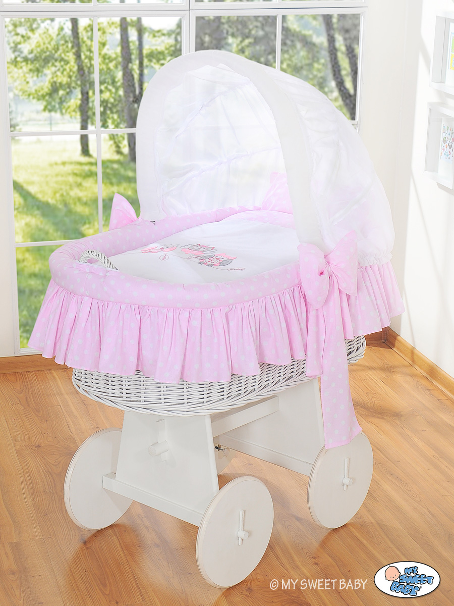 • Fahrgestell aus echtem Holz. SEHR STABIL! Höheres Untergestell als bei den anderen Herrsteller - 50cm. Es ist sehr bequem zum benutzen, weil man sich nicht so bücken muss. • Das Untergestell ist in einer zartbraune Farbe und ist mit einem ökologischen Lack behandelt Große Leichtlaufrädern aus vollem Holz (Durchmesser 30 cm) mit weißen Gummireifen, die sich sehr leicht drehen. Sehr leise auch auf den Parkett, oder Fliesen • Der Korb ist aus Weide durch Handarbeit gefertigt. MEGA GROßE LIEGEFLÄCHE 80cmx45cm, daher länger Nutzbar. • Der Griff beim Korb ermöglicht den Wagen leicht umzustellen. • Das spezielle Haubenmechanismus erlaubt die Haube in alle Positionen aufzustellen. Er ist auf Dauer an den Korb befestigt und die ausgewählte Elemente können sehr leicht abmontiert werden. Dadurch kann der Haubenbezug leicht zum waschen abgenommen werden und ist wieder leicht zurück anzubringen. • Auf jedem Korb liegt eine kuschelige in Baumwolle eingenähte Vliesschicht (2 cm dick). Das macht aus dem Korb ein weiches Nestchen, dass die Geräusche dämpft, und wo Eures Kind geborgen schlafen kann. Das Sortiment enthält auch ein Kissen (35x37cm) und eine Decke (78x78cm) mit einer speziellen Ausfüllung aus Polyestergewebe - bieten einen optimalen Schlafkomfort, sind sehr gesund und werden für die Babys und Allergiker empfohlen. Decke und Kissen in den selben Farben wie der Korbbezug. Alle Elemente können in der Waschmaschine gewaschen werden. • In die Standardaustattung wird zusätzlich eine Matratze aus Pressvlies dazugegeben. Sie ist 4 cm hoch, oval, luftdurchlässig mit einem abnehmbaren, gesteppten Bezug - Waschbar bis 40 Grad. Rosa Adele Zibi Bigi Eulen Haube Bollerwagen
