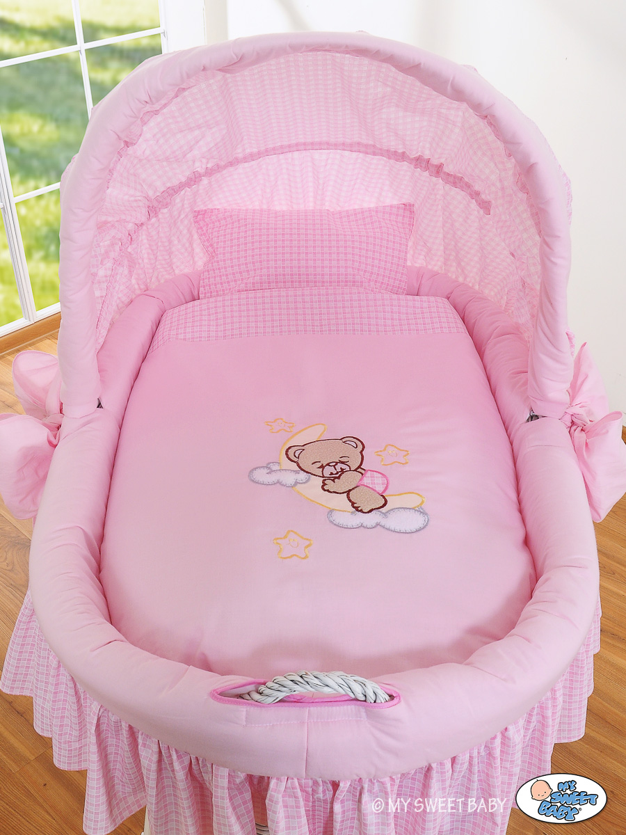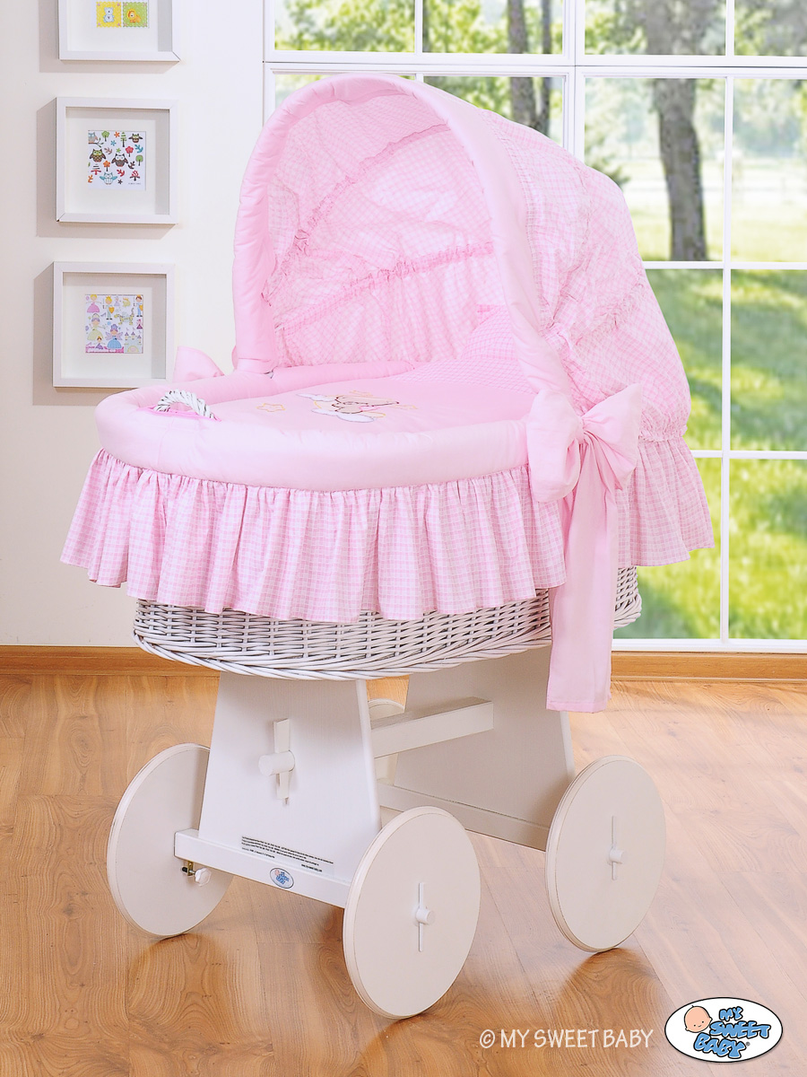 • Fahrgestell aus echtem Holz. SEHR STABIL! Höheres Untergestell als bei den anderen Herrsteller - 50cm. Es ist sehr bequem zum benutzen, weil man sich nicht so bücken muss. • Das Untergestell ist weiß lackiert mit ökologischen Farben, Große Leichtlaufrädern aus vollem Holz (Durchmesser 30 cm) mit weißen Gummireifen, die sich sehr leicht drehen. Sehr leise auch auf den Parkett, oder Fliesen • Der Korb ist aus Weide durch Handarbeit gefertigt. MEGA GROßE LIEGEFLÄCHE 80cmx45cm, daher länger Nutzbar. • Der Griff beim Korb ermöglicht den Wagen leicht umzustellen. • Das spezielle Haubenmechanismus erlaubt die Haube in alle Positionen aufzustellen. Er ist auf Dauer an den Korb befestigt und die ausgewählte Elemente können sehr leicht abmontiert werden. Dadurch kann der Haubenbezug leicht zum waschen abgenommen werden und ist wieder leicht zurück anzubringen. • Auf jedem Korb liegt eine kuschelige in Baumwolle eingenähte Vliesschicht (2 cm dick). Das macht aus dem Korb ein weiches Nestchen, dass die Geräusche dämpft, und wo Eures Kind geborgen schlafen kann. Das Sortiment enthält auch ein Kissen (35x37cm) und eine Decke (78x78cm) mit einer speziellen Ausfüllung aus Polyestergewebe - bieten einen optimalen Schlafkomfort, sind sehr gesund und werden für die Babys und Allergiker empfohlen. Decke und Kissen in den selben Farben wie der Korbbezug. Alle Elemente können in der Waschmaschine gewaschen werden. • In die Standardaustattung wird zusätzlich eine Matratze aus Pressvlies dazugegeben. Sie ist 4 cm hoch, oval, luftdurchlässig mit einem abnehmbaren, gesteppten Bezug - Waschbar bis 40 Grad. Rosa Nacht Gute Haube Bollerwagen